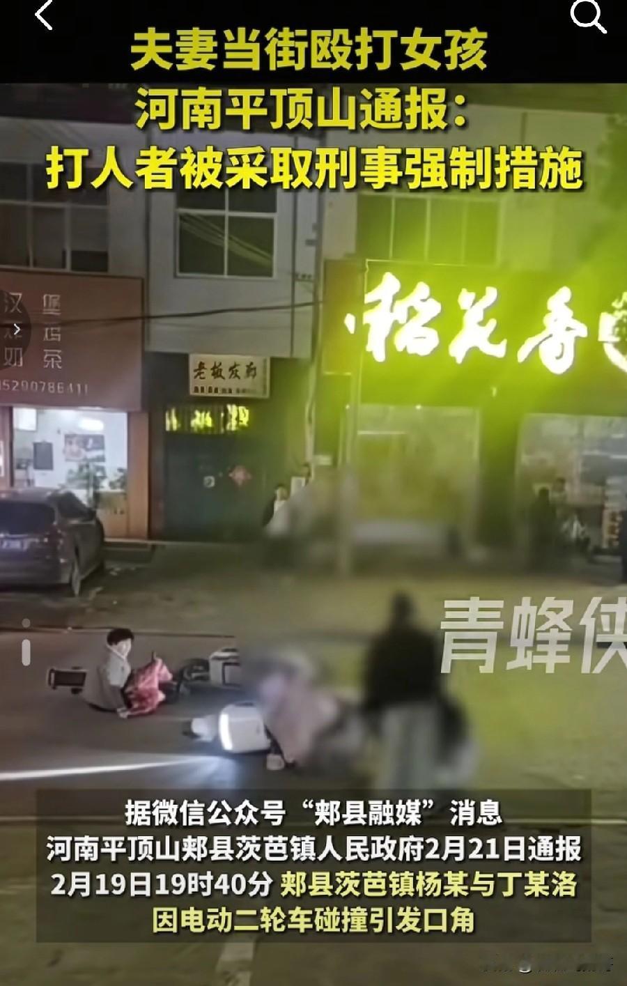 两辆电车双撞,非常普通的交通小事故,谁能想到,结果竟然酿成2人被刑拘1人陷入昏迷急救的悲剧! 这事发生在河南平顶山。2月19日,也就是大年初四。 杨某跟丁某洛的二轮电动车相撞。 随后杨某喊来儿子儿媳。 杨某儿子儿媳到现场后对丁某洛进行了辱骂和殴打。 丁某洛受伤严重,处于昏迷状态,她还是未成年,才15岁。经此一难,中考可能都会受影响。 打人者也就是杨某儿子儿媳已被刑事拘留。 此悲剧根源就是骑二轮电车跟丁某洛的电车相撞的杨某,两车相撞杨某不走法律维权,而是找儿子儿媳当帮手。 儿子儿媳也是蠢到一起了,一到场就打人。对方还是未成年小女孩,难以理解下手为什么那么狠。 打人时倒是痛快,打人的后果呢,却完全不考虑。 打人的夫妻二人被刑拘。 被打女孩还处于昏迷状态,民事赔偿应该也不会是小数。 可以说打人者的家基本毁了。 一个家,没一个有理智的人,不毁才怪!