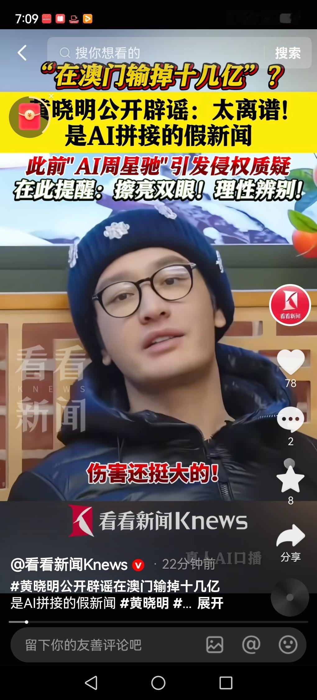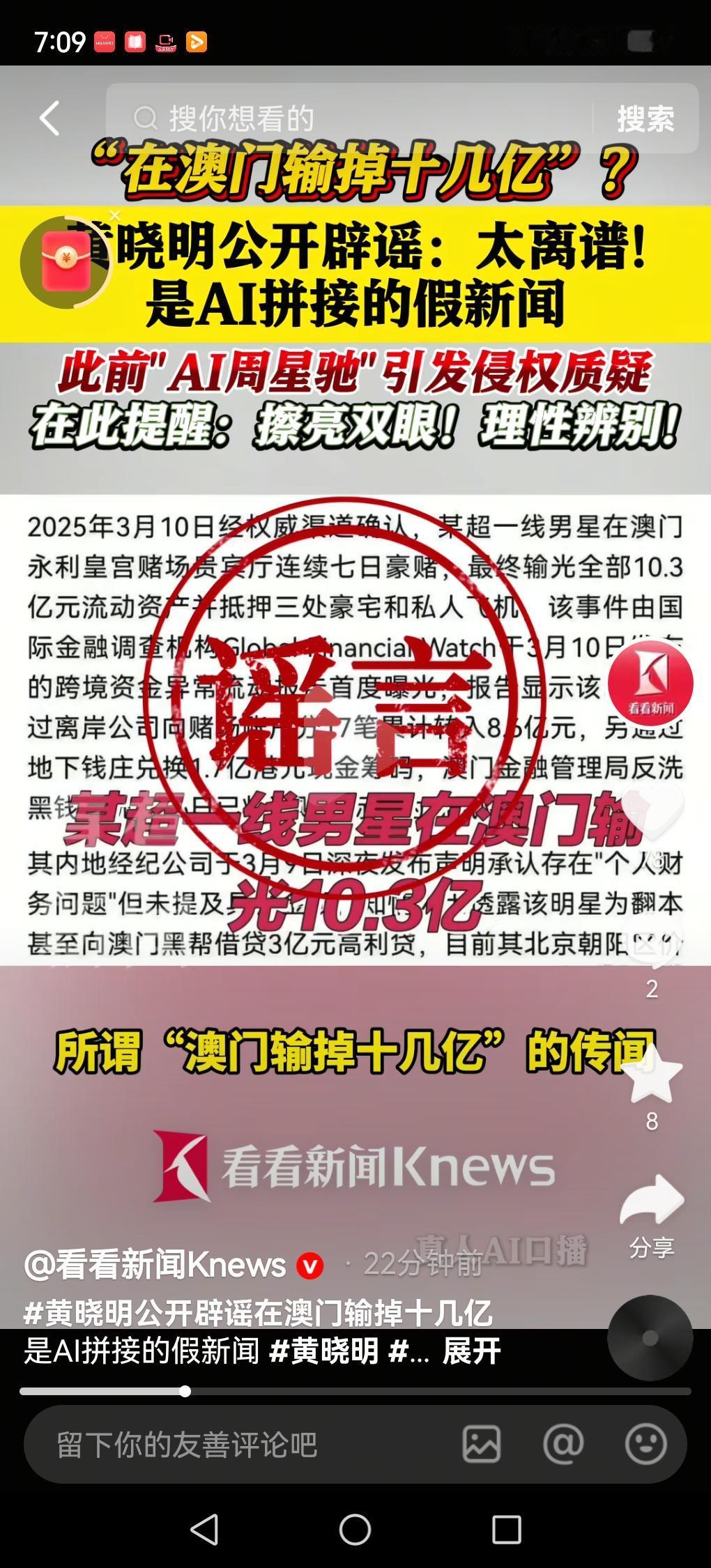 我特别反感网上那些博主用名人的声音生成的AI.视频,一听到这种声音我就容易有一股无名火气,最后不想和人计较,直接划掉。那些人特别喜欢用王立群教授的声音。去配乱七八糟的鸡汤、玄学、“你要起势了”,本质就是蹭流量、毁人设、骗信任。好好的学术声音,被拿去搞低级收割,换谁听了都膈应。 更过分的就是AI造谣: 给黄晓明P赌博、给普通人P不雅、给名人P言论……AI本来是工具,现在成了造谣成本最低、伤害最大的武器。 我支持黄晓明走法律途径: - 未经许可克隆声音、伪造形象,已经不是“玩梗” - 是侵权、诽谤、扰乱公共秩序 现在太乱了:谁火就克隆谁,谁有流量就伪造谁,真的假的混在一起,看得人烦躁又无力。 最后选择划走、不跟人吵,不是怂,是不想被垃圾消耗。但这种事,真的需要有人站出来告、有人较真、有人推动监管。 AI可以创新,但不能用来作恶。 这股歪风,确实该狠狠刹一刹了。(图片信息来源:看看新闻Knews)AI虚假内容 AI谣言 AI社交现象 AI对文学影响 ai学术 AI颠覆文学 AI文学价值