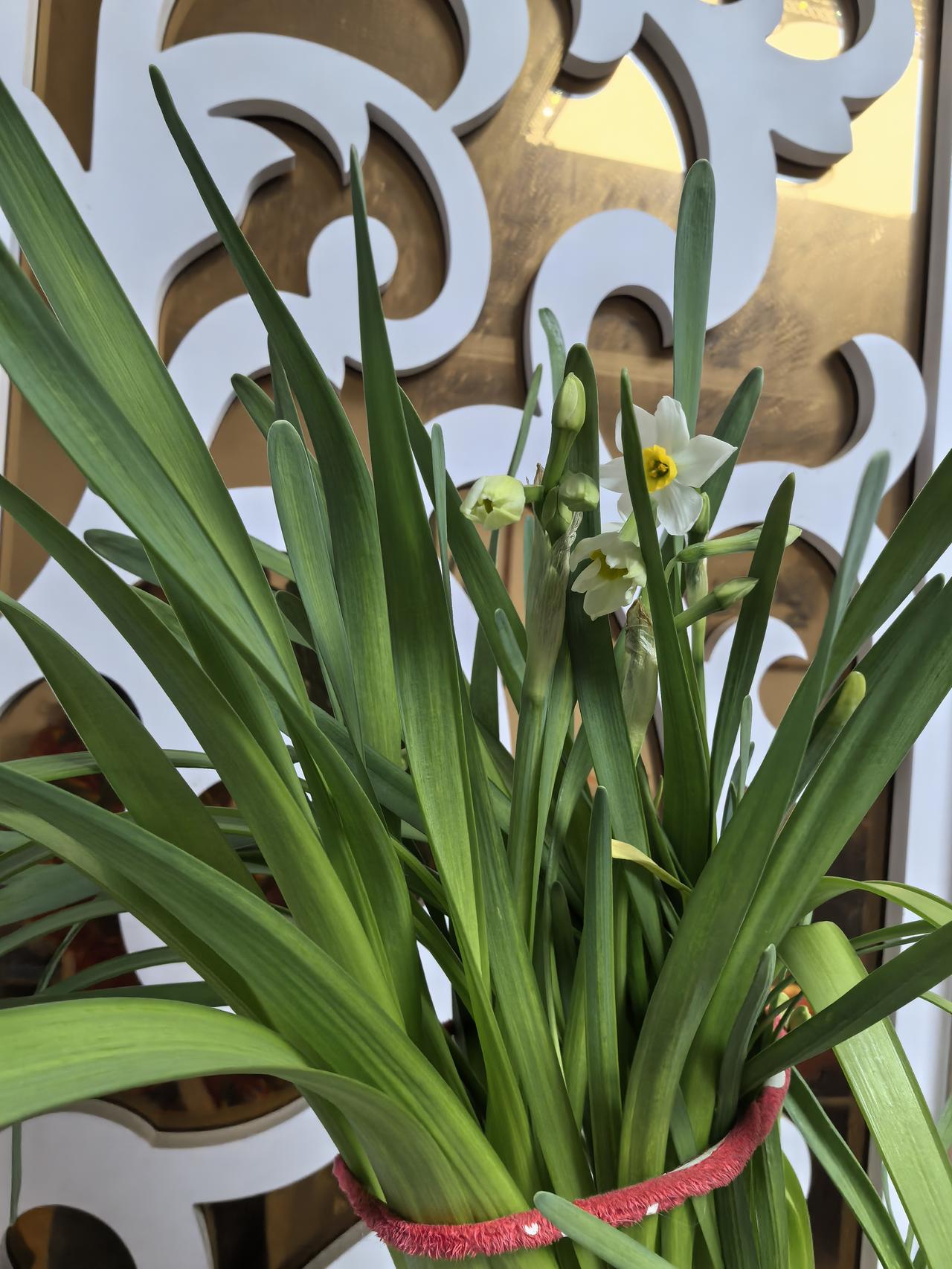 报告:水仙花开啦! 种的水仙,期待它除夕能开花,结果,辜负了我的期许,应该是怪我管理及养育的问题。 首先,没有见过太阳光,所以一直长叶子,长的细长的枝条。 没有办法,只能拿绳子捆着。 其次,没有切割好花球。这个真心不会。 最后,家里温度过低延迟了开花期。 不过,它总算是开了,虽说迟了几天,但是,它真的没有“装蒜”呢,哈哈。 明天再养水仙,就应该可以避雷了吧。