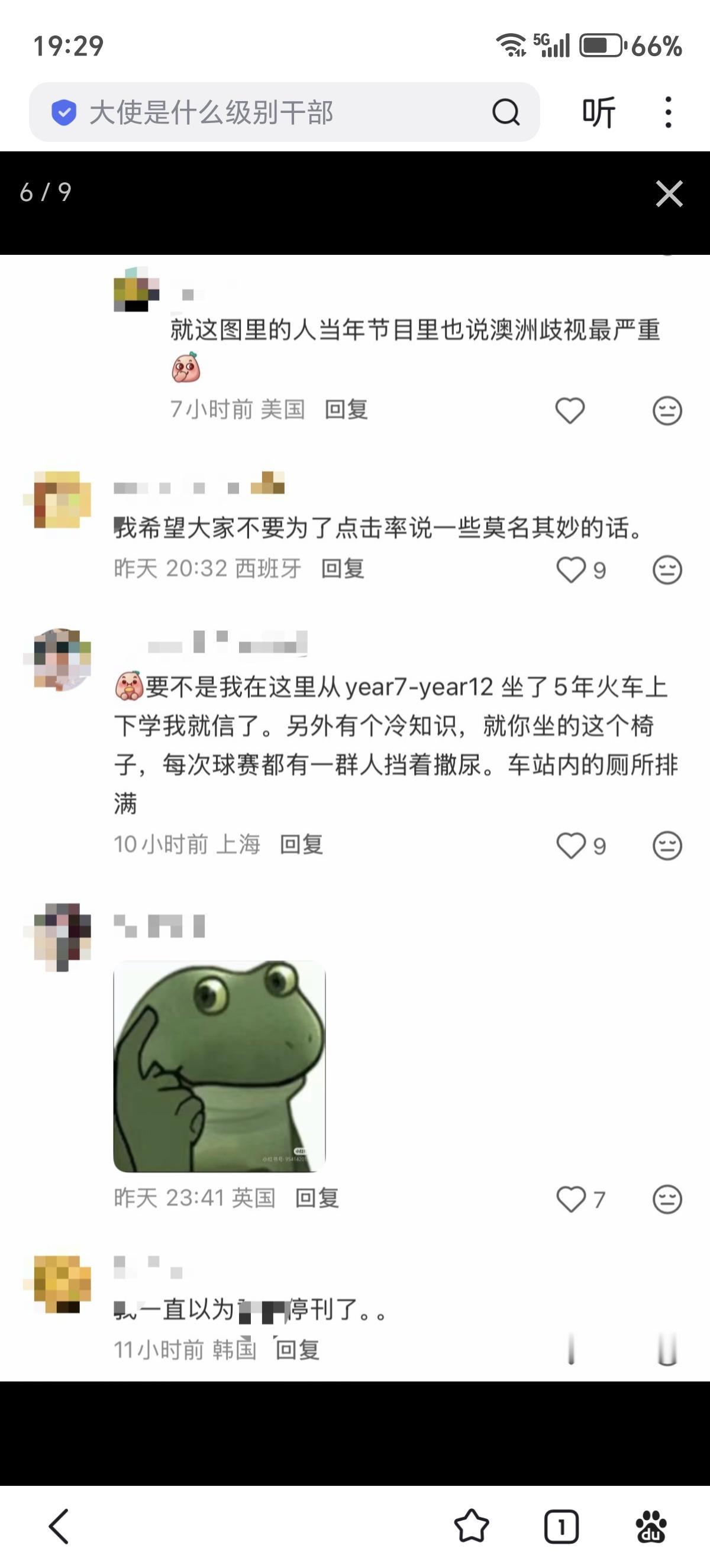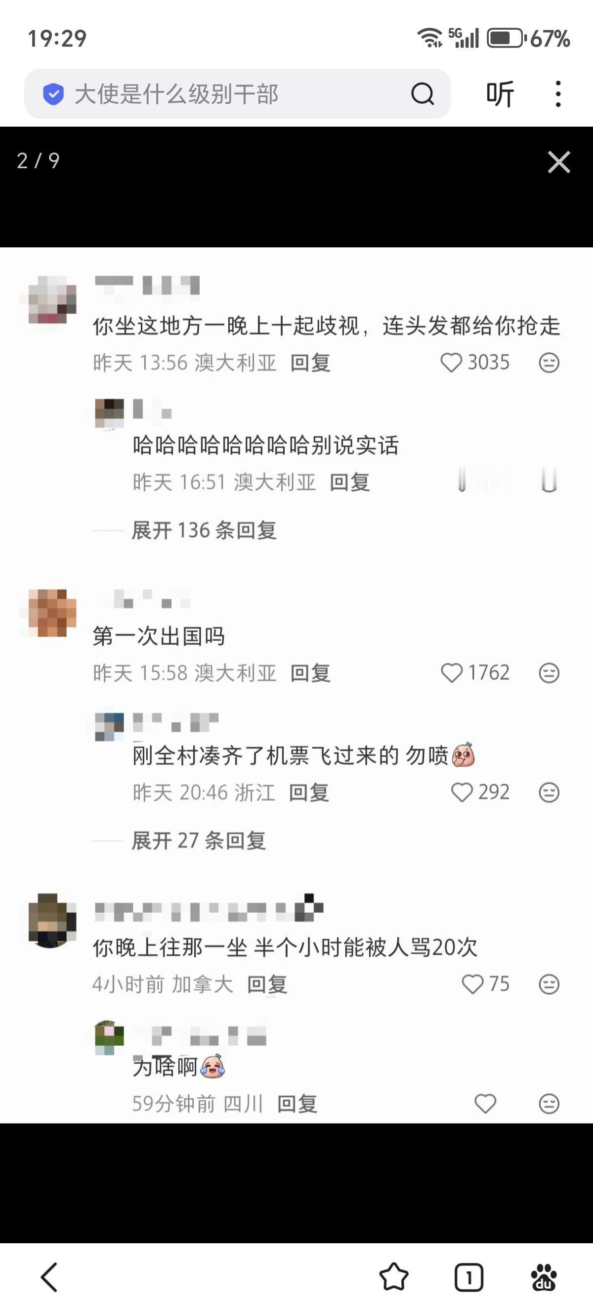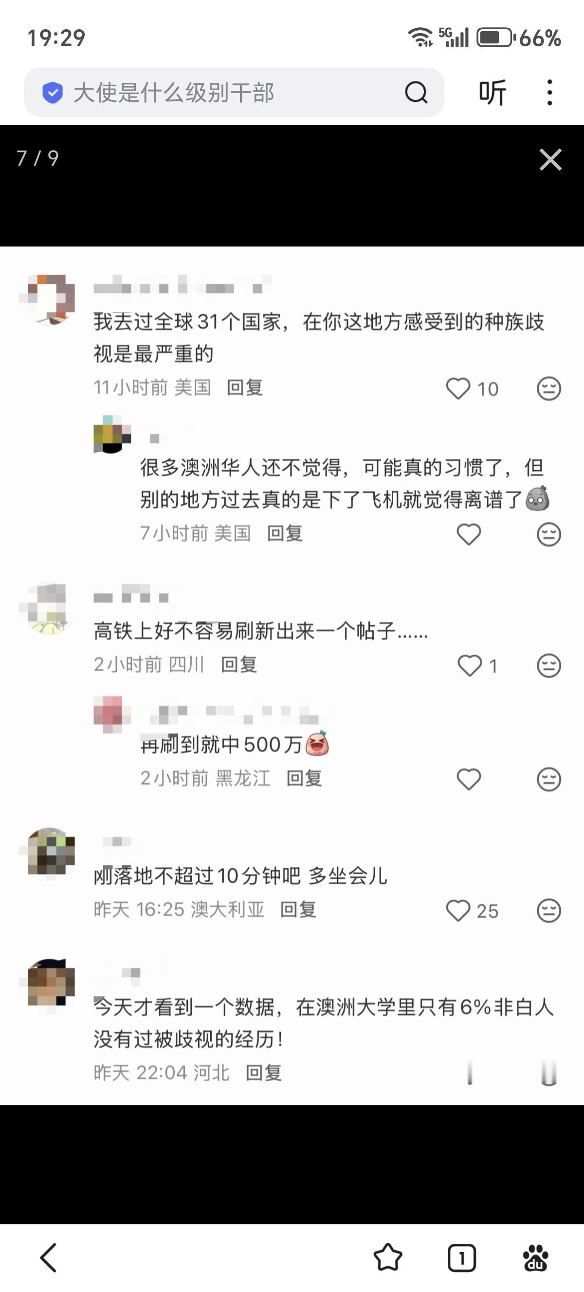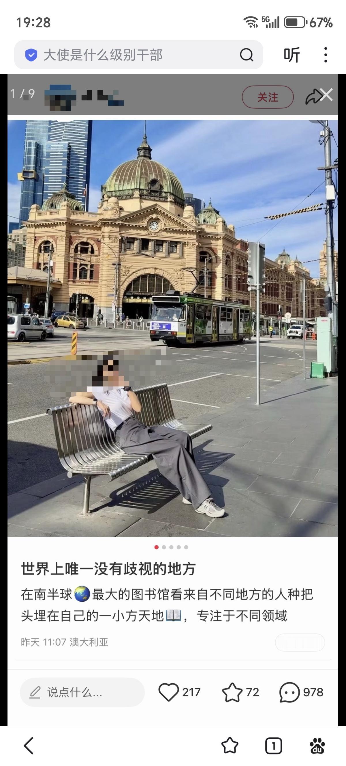 网友在澳大利亚分享:“世界上唯一没有歧视的地方。” 网友在澳大利亚回复:“你坐的这个地方是刷怪笼 ,我平时尽量不在这里多呆”、“要不是我在这里从year7-year12 坐了5年火车上下学我就信了。另外有个冷知识,就你坐的这个椅子,每次球赛都有一群人挡着撒尿。车站内的厕所排满”、“你坐这地方一晚上十起歧视,连头发都给你抢走”。看评论区各种海外ip,苦澳村久矣?