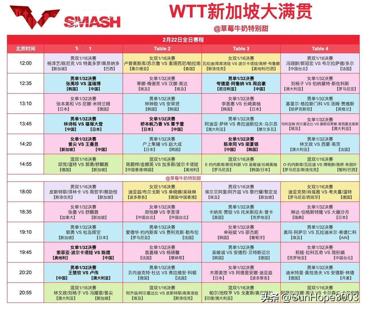 新加坡大满贯2.22日赛程表,以及孙颖莎首轮对手已产生。 截至目前,资格赛的比赛已经全部完成,首轮是资格赛的对手也已经产生了, 莎莎首轮对战帕拉南,现在开始可以准备对手了,莎莎加油。 22日,国乒有8位选手开始比赛,其他的队员都在23日完成比赛。 从12:35开始,每一场比赛都很精彩。 王楚钦在晚上8点20的场次比赛,加油加油!