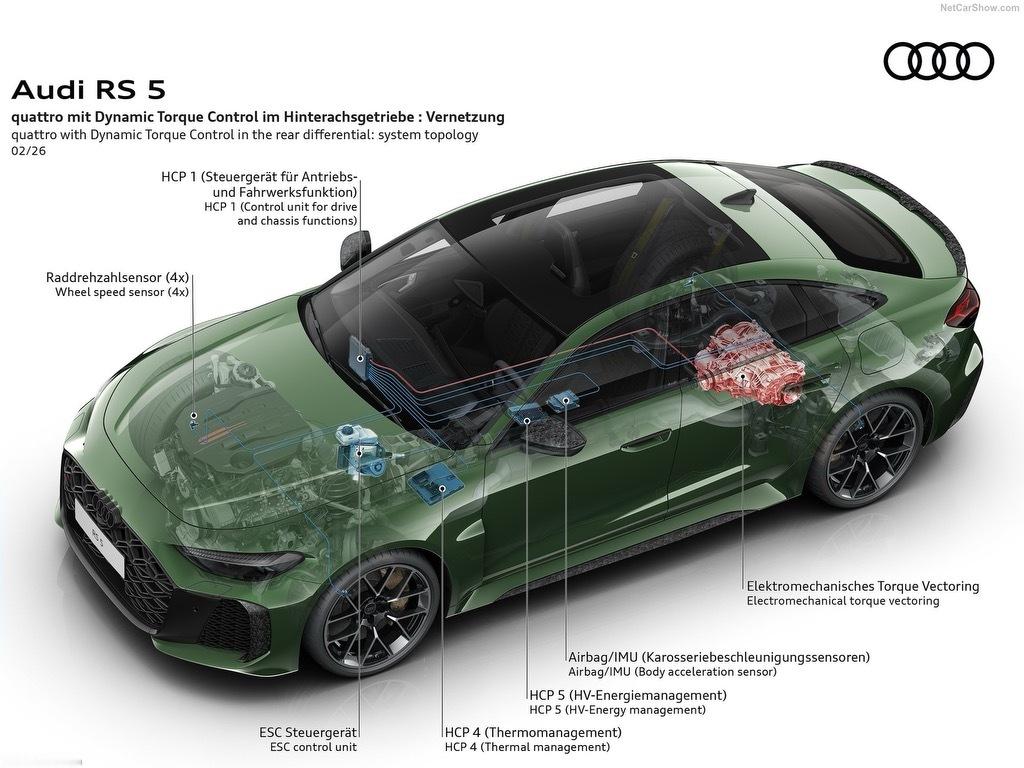 全新奥迪RS 5官图发布,新车依旧提供三厢轿跑版和旅行版车型,基于PPC高级燃油车平台打造,搭载2.9T V6双涡轮增压发动机组成的插混系统,0-100km/h加速3.6秒。 动力方面,新车搭载2.9T V6双涡轮增压发动机组成的插混系统,发动机最大功率510马力,最大扭矩600牛·米,电动机最大功率177马力,最大扭矩460牛·米,二者结合,综合功率639马力,综合扭矩825牛·米,0-100km/h加速3.6秒。新车提供22kWh的电池包,纯电续航80km。 新车还为quattro全轮驱动系统配备了新的中央差速器,减轻弯道推头现象,动态扭矩控制系统是一种机电式扭矩矢量分配后桥差速器,能在毫秒间调整后轮之间的扭矩分配。