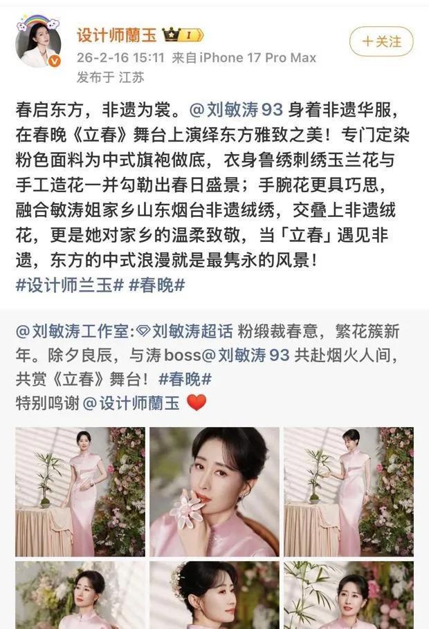 你以为刘敏涛春晚那身粉旗袍只是贵?错了。那件衣服,电商仿不出来。 它的粉,是单独开缸为你染的。布浸下去那一刻,这世上就多了一种独一无二的颜色。 衣角到领口的玉兰,是山东绣娘用鲁绣一针针“生抠”出来的。手腕那朵烟台绒花,用到的可是非遗级别的工艺。 春晚刚播完,刘敏涛那身粉色旗袍直接刷屏了!估计不少人第一反应就是,赶紧网上搜“刘敏涛春晚同款”。 可那注定是白费劲,这件衣服,电商就算把缝纫机踩冒烟,也绝对仿不出来!你以为它只是贵?错!它贵的根本不是面料和设计,而是藏在每一寸布料里、花钱都买不到的匠心,这才是最让人震撼的地方。 平时在网上买的旗袍,颜色不是太艳就是发灰,印的花纹一眼假,可刘敏涛身上这件粉旗袍,那颜色简直绝了,温柔又高级,一点都不腻人。 为啥电商仿不出来?因为这粉色根本不是现成的染料,而是设计师专门为她单独开缸定染的。布往染缸里浸下去的那一刻,这世上就多了一种独一无二的粉色,没有标准色号,没有批量生产,就这一件,穿在刘敏涛身上,就是专属的春日温柔。 电商想仿,连调颜色的底气都没有。再看衣服上的细节,从衣角到领口的玉兰花,可不是机器印花,更不是普通刺绣,是山东的绣娘用国家级非遗鲁绣,一针一线“生抠”出来的。 鲁绣有多讲究?绣娘得拿着针线,对着玉兰花的形态,一点点勾勒、一层层叠加,花瓣的渐变、花蕊的细腻,全靠手上的功夫,绣一朵花就得花好几天,一套衣服的玉兰花,更是要绣娘熬上数十个日夜。 这种纯手工的温度,机器流水线怎么可能复制?电商做的仿款,顶多印个玉兰图案,连花瓣的立体感都没有,一眼就能看出差别。 最绝的还在手腕上,那朵看似不起眼的小花,用到的可是双重非遗工艺!它融合了烟台的绒绣和绒花技艺,绒绣得先煮丝、染色,再用绒线在网布上绣出油画般的质感,绒花则要靠手工把蚕丝捻成线,再盘绕定型,十几道工序下来,才做出这朵永不凋零的腕花。 刘敏涛是烟台人,这朵花、这身旗袍,都是她对家乡非遗的温柔致敬,这份情怀,电商仿得出来吗?肯定不能! 以前总觉得,明星的衣服贵就贵在品牌和名气,可看了刘敏涛这件旗袍才明白,真正的奢侈品,从来不是logo,而是背后的非遗匠心和文化底蕴。 现在很多人追捧国外大牌,觉得那才叫高级,却忘了咱们老祖宗传下来的鲁绣、绒花,才是真正的顶级工艺。 这次春晚,刘敏涛穿着这身藏满非遗的旗袍唱《立春》,把中式美学的浪漫展现得淋漓尽致,也让这些快被遗忘的老手艺,重新走进了全国观众的视野。 电商仿不出来,其实是件好事,这恰恰说明,纯手工的匠心、非遗的魅力,是流水线生产永远无法替代的。 所以别再盲目跟风买仿款了,那些没有灵魂的衣服,穿几次就腻了。而像这样融入了非遗技艺的华服,不仅好看,更承载着咱们的文化根脉。 刘敏涛用一身旗袍证明,真正的美,从来不是批量复制的网红款,而是独一无二的匠心之作。这才是时尚的最高境界,也是中国人该有的文化自信! (每天更新,欢迎关注,喜欢文章的可以帮忙点个赞留条评~) 对此大家有什么看法? MCN微头条