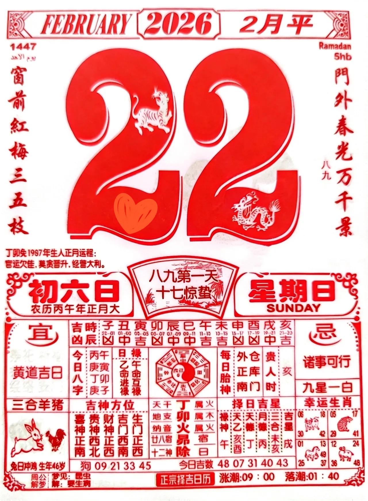 明天日子特别好,明天是公历2026年2月22日。农历一月六日,星期日。明天是大年初六。周日遇上黄道吉日,诸事顺遂、福气拉满。 喜神在正南、贵神在西北、财神在正西,吉门西南、生门正西,找准方位就能接住一整年好运。 幸运生肖是牛、虎、马、羊,吉数07、31、40、43、48,随手用都能添喜气。 这一天不仅寓意六六大顺,更是除旧迎新、开启新程的好时机,带着好彩头出发,做什么都顺顺利利。 愿大家接住这份吉日好运,你准备好迎接一整年的顺风顺水了吗?