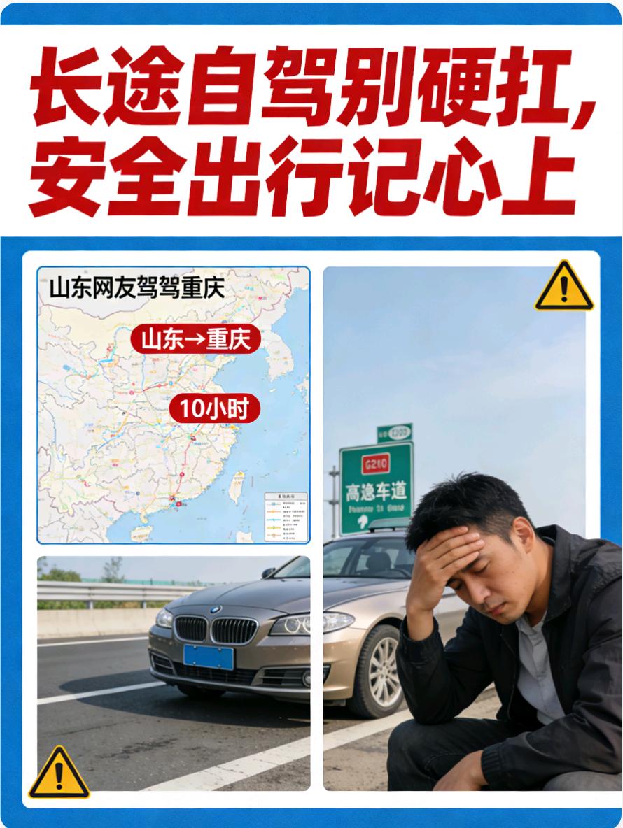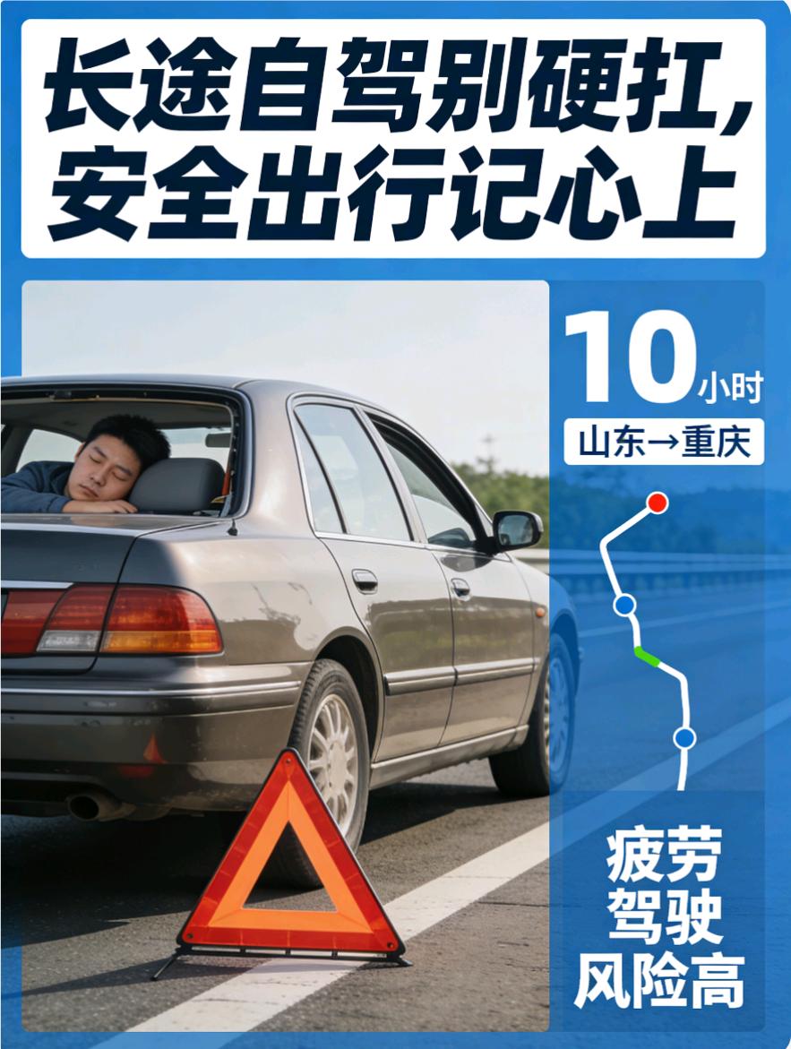 山东网友自驾重庆,开10小时直接弃车!长途自驾千万别硬扛⚠️ 山东网友自驾去重庆,足足开了10小时,又累又困扛不住,最后直接弃车改高铁,真是又心疼又真实😥 山东到重庆全程近1500公里,正常要开18小时以上,连续驾驶极易疲劳驾驶,危险系数直接拉满💥 交通法规明确规定:连续驾车超4小时,必须休息20分钟以上,疲劳驾驶会让反应变慢、判断力下降,高速上一秒都不能大意🚗💨 长途自驾前一定要检查车况,规划好休息点,多人轮流开车,千万别为了赶路硬撑。 出门旅行,平安永远比速度重要❗️合理休息、文明驾驶,才能一路顺利、开心出行~✨长途自驾感悟 山东自驾游 长途自驾游 山东自驾攻略 浙江到重庆旅游 山东人游重庆 重庆四川自驾游