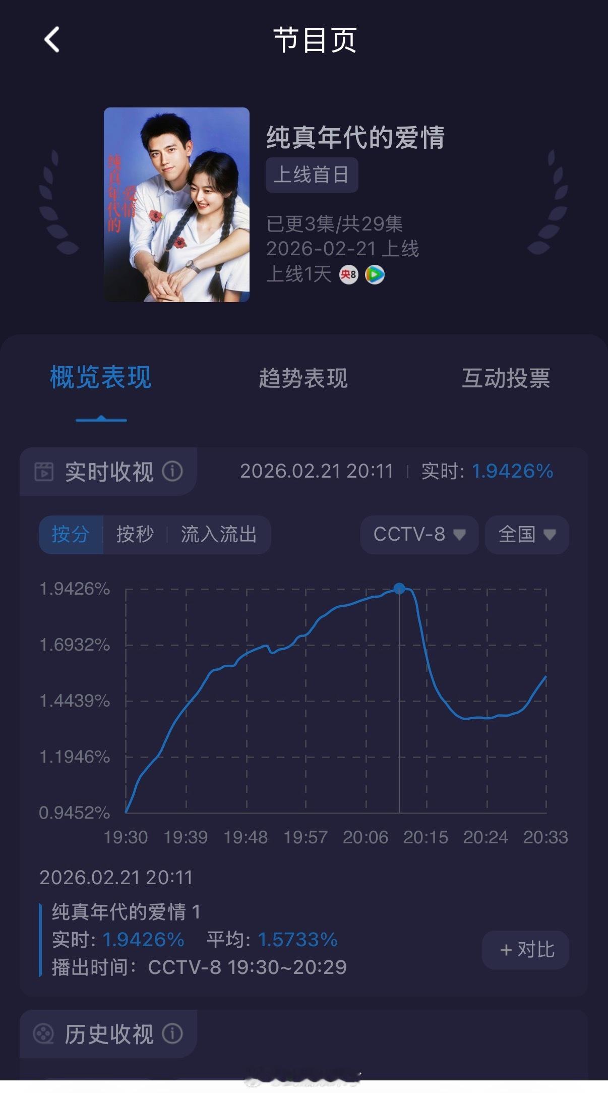 陈飞宇《纯真年代的爱情》首日4集,单集各2广,央八开播后一路上升,峰值目前1.94