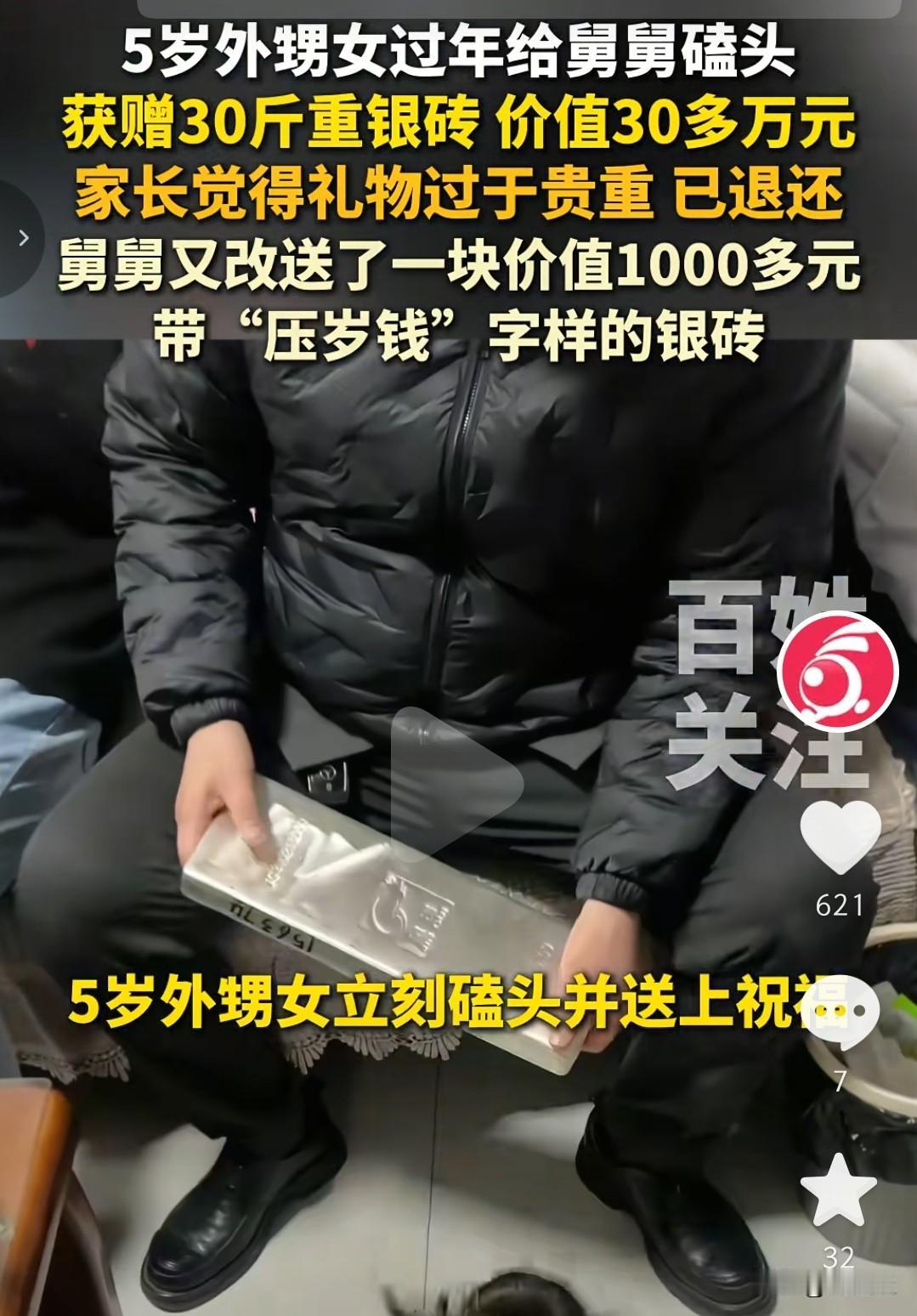 最硬核的舅舅,送最贵的压岁钱!年夜饭后酒过三巡,舅舅借着酒劲,从车里费劲搬来30斤重的银砖。5岁外甥女一听磕头就给,立马跪地送上祝福。这块价值30多万的银砖,堪称全网“最重”压岁钱。 我猜,舅舅其实早就准备好给外甥女送价值1000元、写有“压岁钱”的银砖,只是喝了点酒,迷迷糊糊拿错了那块大的。等他清醒过来,估计肠子都悔青了,还好姐姐心疼弟弟,主动把银砖换了回去。 舅舅拗不过,又换了块千元“压岁钱”银砖,既守住了心意,也让这份宠爱有了最合适的归处。这一波推拉间,藏着长辈毫无保留的疼惜,也藏着晚辈懂分寸的通透,成为这个春节里最暖心的硬核名场面。