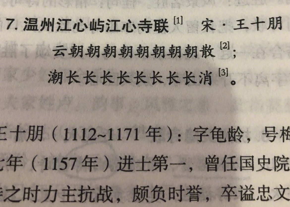 一副对联几十种读法 你敢应战吗被一副对联整不会了 温州江心寺门口那副“云朝朝朝朝朝朝朝朝散,潮长长长长长长长长消”的对联,利用汉字一字多音、一字多义的特点,据说读法多达几十种,写的正是瓯江潮水。江心寺所在的江心屿,稳稳扼守瓯江中游,宛如天然城门守护着温州古城,向来有“瓯江蓬莱”的美誉。