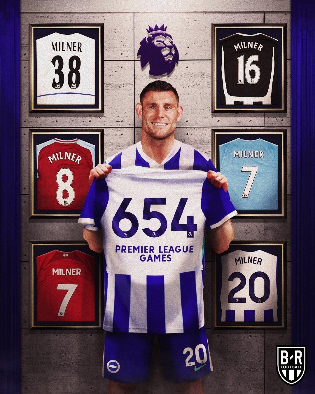 【米尔纳创造历史】英超第27轮,布莱顿客场对阵布伦特福德,40岁的詹姆斯·米尔纳首发出场! 本场比赛是米尔纳第654次英超出场,由此超越加雷斯·巴里,成为英超历史出场次数最多的球员。 米尔纳的英超生涯始于2002年11月,先后效力于利兹联、纽卡斯尔、阿斯顿维拉、曼城、利物浦和布莱顿,至今仍保持着一线队出场能力,堪称职业球员的自律典范。布莱顿