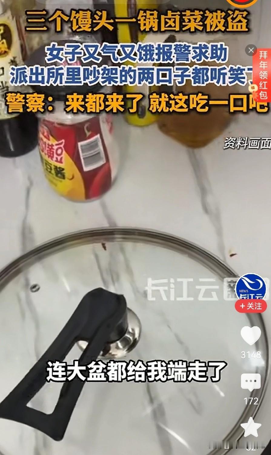民警都被逗笑了,报案人好不容易蒸了一锅馒头被偷走3个,一锅卤菜连盆端走,这金额立不了案,那你好歹来局里吃一口饭吧。 最近安徽这起报案真的又好笑又暖心,连在局里吵架的两口子都被逗笑的接受了民警的调解。 原来一女子辛辛苦苦在家准备吃食,好不容易蒸了一锅香喷喷的馒头,结果一转头,莫名其妙被偷走了3个,更离谱的是,满满一锅刚卤好的菜,居然连锅带菜直接被人端走了! 主人家又气又无奈,走到派出所这股劲又消了,但是还是忍不住去局里告诉了民警她的奇遇。可民警们一听,全都哭笑不得地说,看到女子饭也没得吃,干脆就在这里吃饭吧 网友看完直接笑喷: 小偷偷馒头,民警管饭吃,这也太可爱了! 虽然东西没找回来,但被民警这波温柔安慰治愈了。 生活里总有这些鸡毛蒜皮的小倒霉,可总有民警用最朴实的善意,化解委屈、抚平情绪。偷几个馒头不算大事,但民警的态度,才是真正的民心温度。也提醒大家,在家一定看好自家美食,别让“吃货小偷”有机可乘呀!
