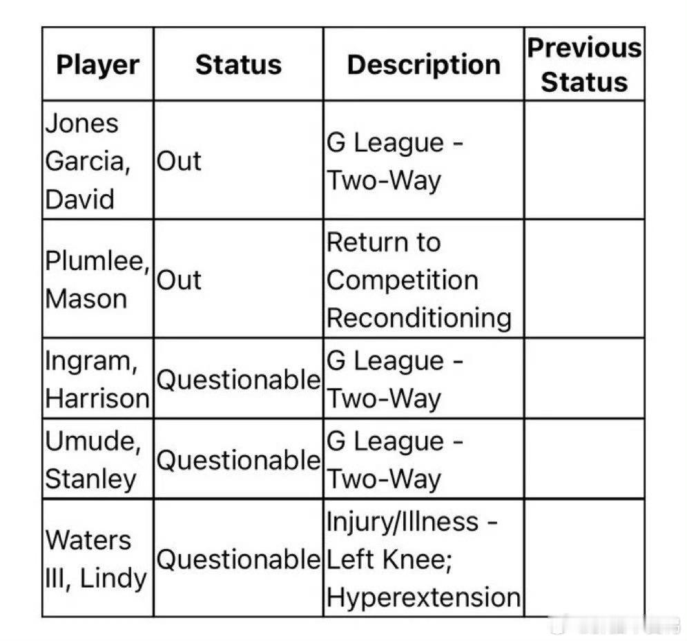 马刺这边——普拉姆利(比赛状态恢复)、加西亚(脚踝手术恢复 )明日缺席!沃特斯(左膝过度伸展)、英格拉姆、乌姆德(G联盟)出战成疑!