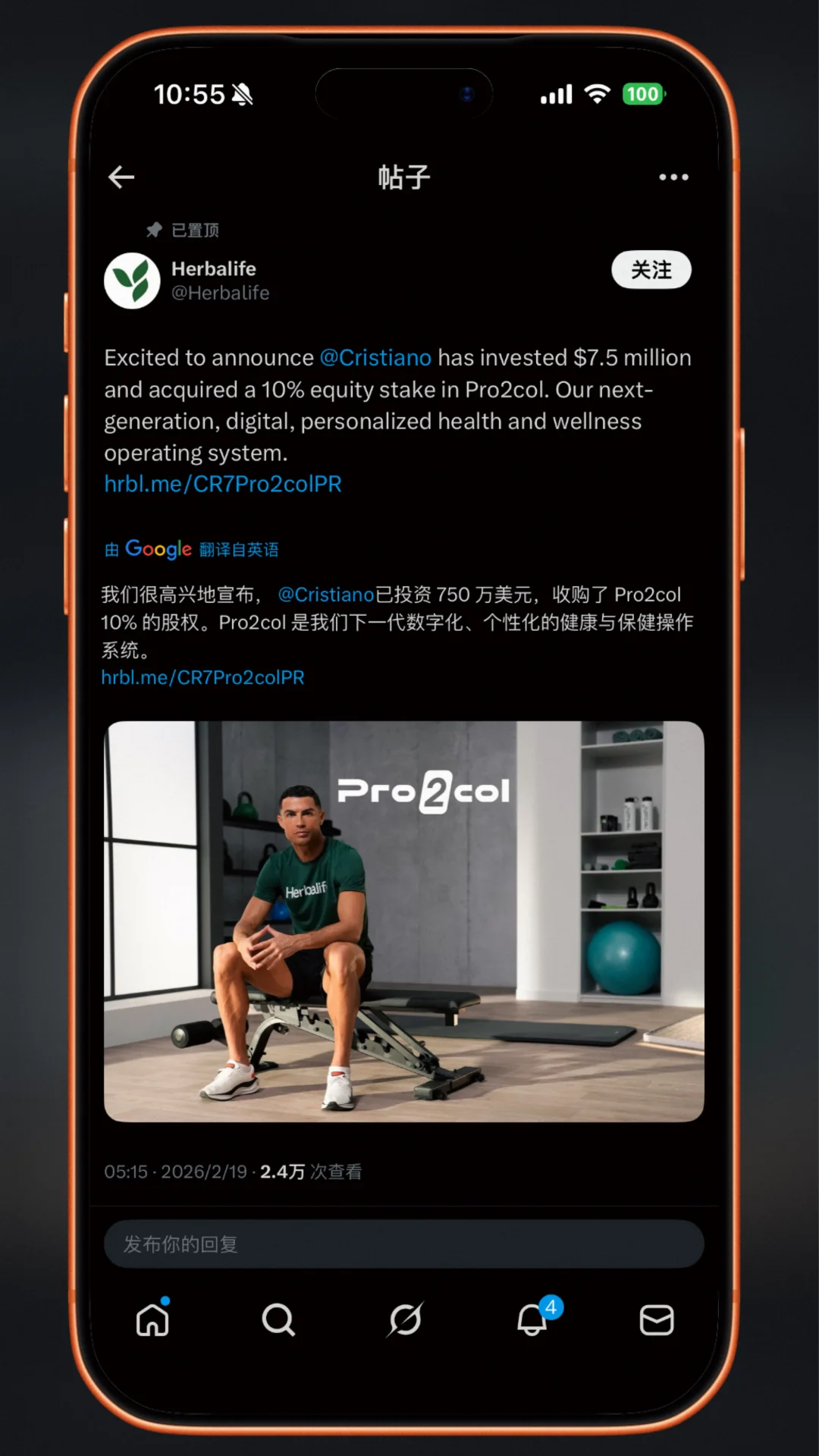 🛑 “十多年来,我们建立了深厚的信任和共同的抱负。投资Pro2col对我来说是水到渠成的事»»除了代言康宝莱之外,更重要的是帮助塑造和发展一个能够真正改变人们健康生活方式的平台,”克里斯蒂亚诺·罗纳尔多说道。“我亲眼见证了康宝莱如何将科学、创新和个性化支持相结合,让健康触手可及。与康宝莱携手打造具有持久影响力的事业,正是我职业生涯现阶段的动力所在。”