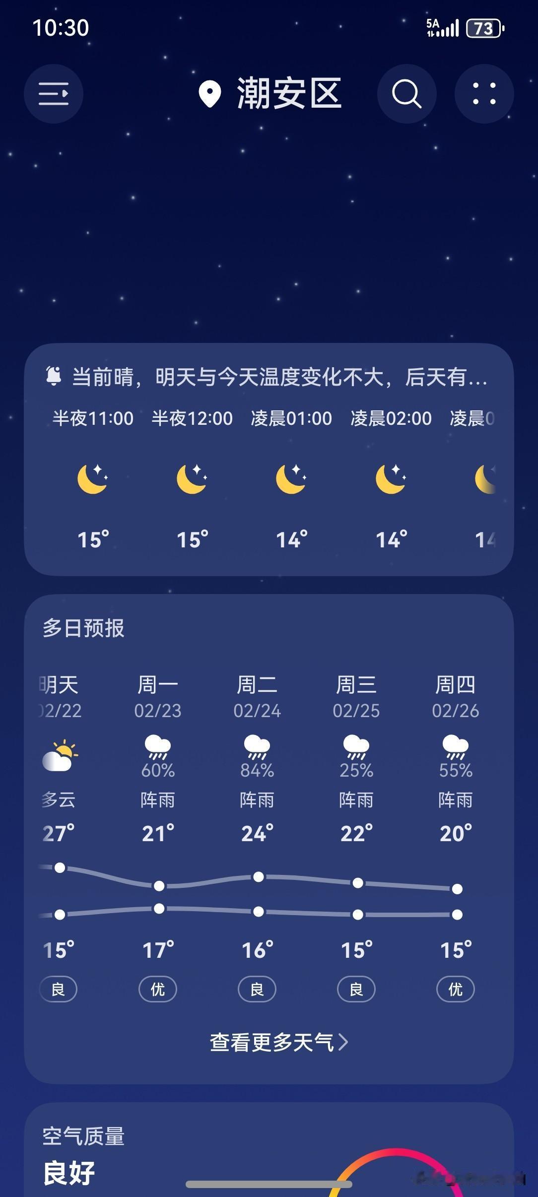 广东:雨雾天气上线,返程注意交通安全,下周将迎来弱冷空气! 未来几天(22~24日),粤北偏北市县多云转阴天,渐转雨雾天气,珠三角和粤东市县,云量增多,间中有分散小雨,粤西市县以多云间阴的天气为主,间中局部有零星小雨。24日白天到夜间,有弱冷空气南下我省,气温小幅下降。 今天(21日),潮州喜提一个多云天气,气温13~26℃,此刻气温15℃,体感温度15℃。 今天虽说是多云天气,但偶尔还是有阳光,气温也是比较暖和的,全天最高气温喜提26℃,令人意想不到的是,居然比昨天还要暖和! 春节前喜提了一波升温,除夕冷空气来袭,气温虽然有所下降,但也不能算冷!初二开始,气温又开始上升了!上升再上升,每天喜提一点点,今天继续上升! 春节期间的这波好天气,必须给10086个赞! 明天的天气还是不错的!后天开始一直都是雨雨雨…… [我想静静][捂脸][笑哭][大笑][我想静静][捂脸][笑哭][大笑]