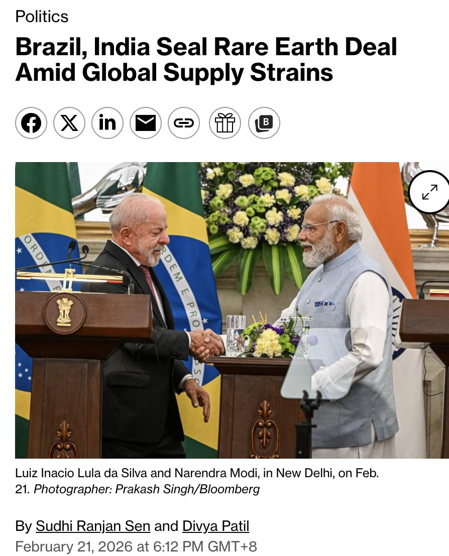 美媒:巴西和印度签署了一项关键矿产协议,旨在全球供应紧张的情况下保障稀土供应。 2月21日,巴西总统卢拉访问印度期间,双方达成共识,将在稀土加工等领域展开合作。印度总理莫迪表示,该协议将有助于打造更具韧性的供应链。