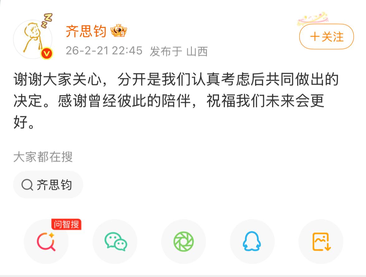 齐思钧官宣分手:我们认真考虑并共同决定。 刘梦章则表示:分手已有半年,他想象的未来和我想象的未来,不太一样。 俊男靓女,且都是主持界的翘楚,但感情这种事,总是充满遗憾。 如果注定未来无法同频,不如好好放下,刘梦章也坦言:“这中间没有任何的错误。” 这句号画的圆满且体面,前路漫漫,朝着各自的的期待,分头走吧……