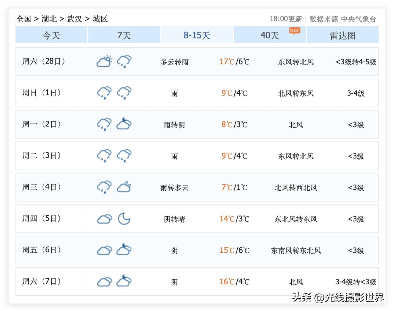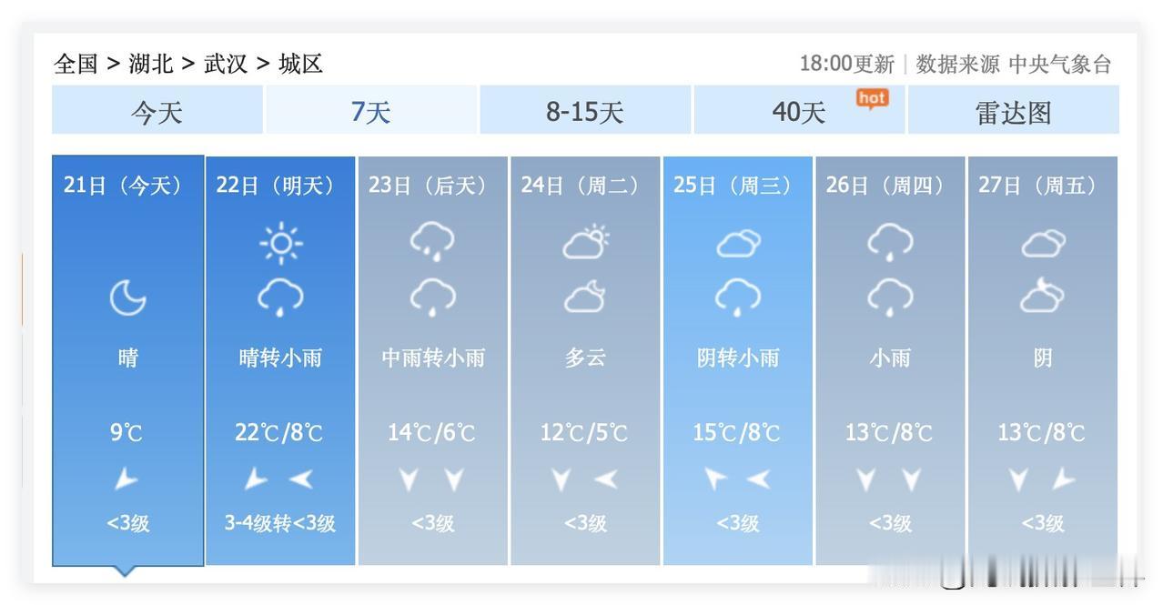 2月22日,大年初六晚上,湖北省武汉市,小雨,湖北省与湖南省及重庆市,大范围降雨,局部暴雨……可是,春运返程高峰来袭,高速公路免费即将结束……2月22日和23日,注定会有很多人抢着上高速公路啊! 2月23日,大年初七,武汉中雨转小雨,大降温……断崖式大降温……超强冷空气来袭啊! 好吧……2026年春节假期,总体来说,武汉天气好到爆炸啊! 可是,2月23日到3月7日,阴雨连绵是武汉的主旋律……冷空气经常南下……武汉经常被速冻…… 3月3日,元宵节,武汉下雨,气温4-9度。 3月4日,武汉气温7度到1度。 …… 哎呀!