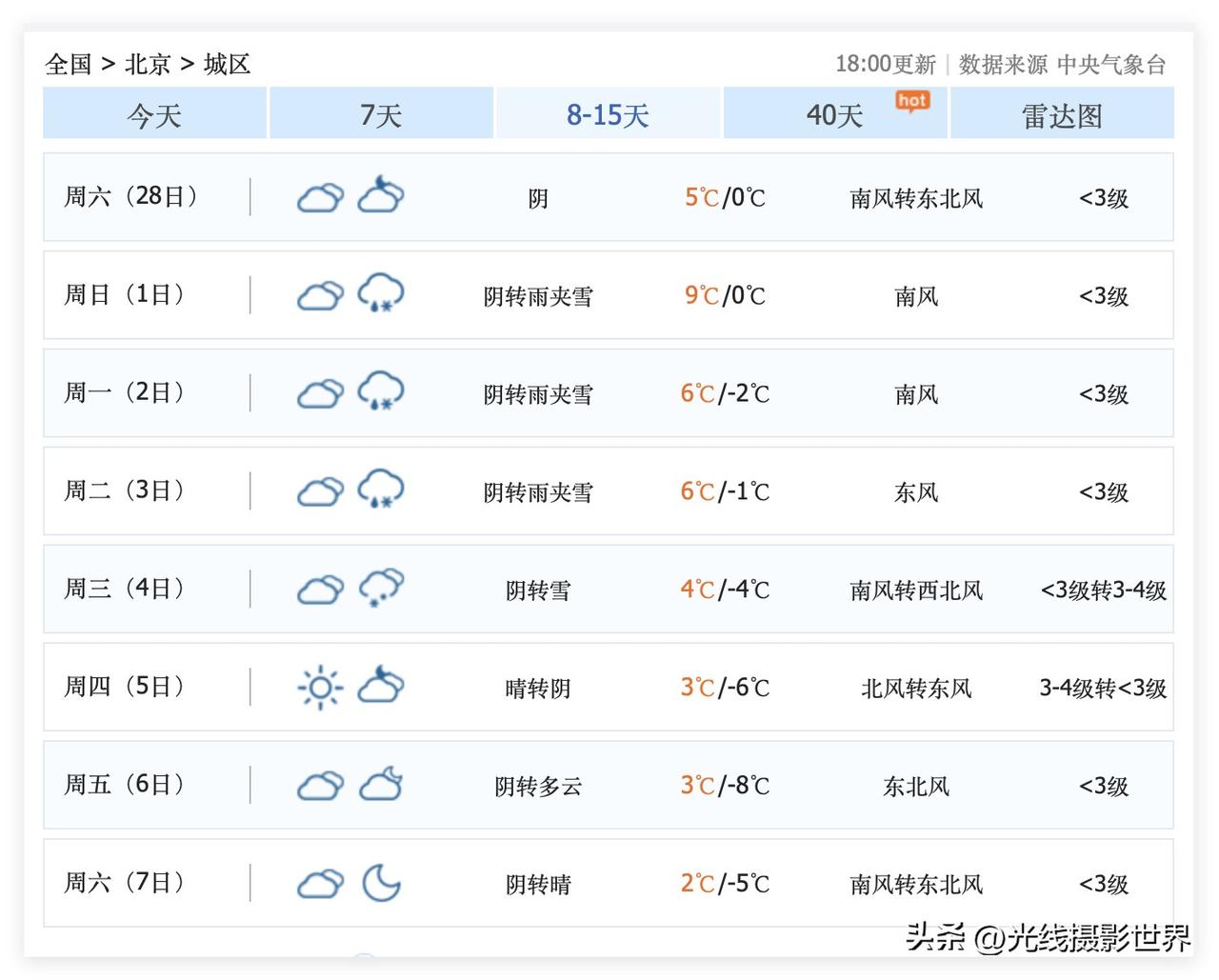 啊啊啊!2月21日,北京,遭遇了沙尘暴的扬沙污染啊!大风刮来,北京市大降温!接下来,北京市持续气温低迷……而且,北京市可能会下雪!2月28日到3月3日,元宵节,北京市可能会下雪! 啊啊啊!万万没想到,2月28日,北京小雨转雪……3月1日,北京阴转雪……3月3日,北京多云转雪…… 哎!2月底3月初,北京市,气温低迷,跌回寒冬……真的是好冷啊! 好吧,想要去北京故宫看雪的摄影发烧友,可以提前买票了!嗯,颐和园,景山公园,天坛,圆明园……元宵节真的会下雪吗?!