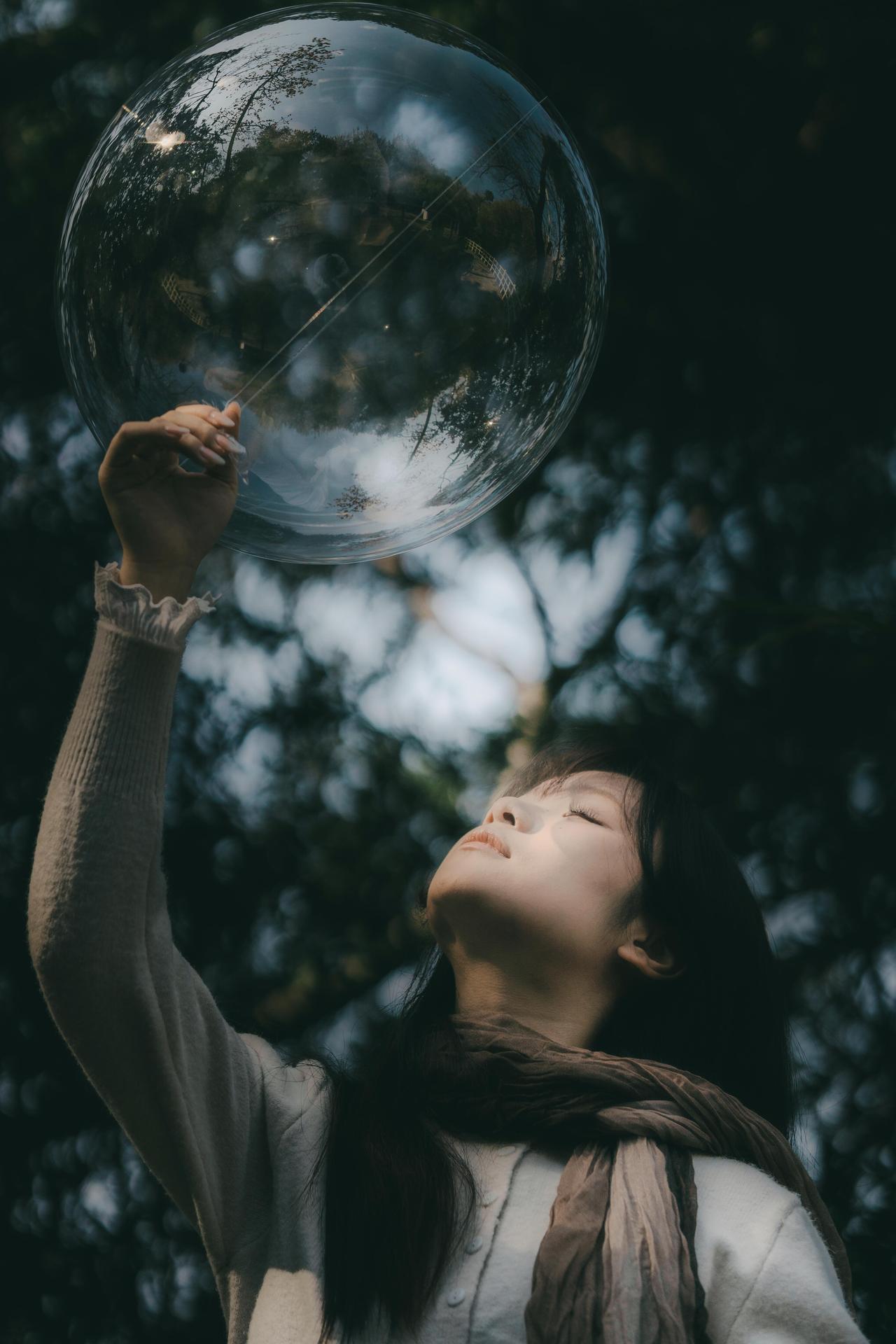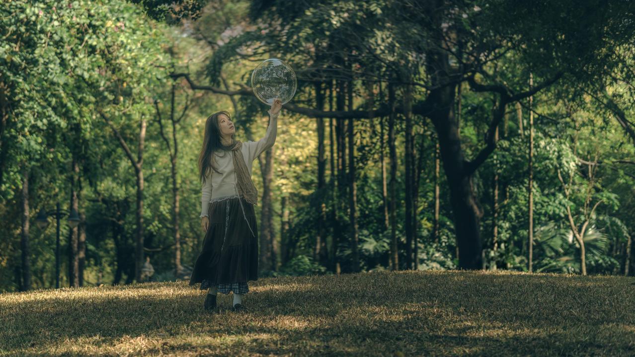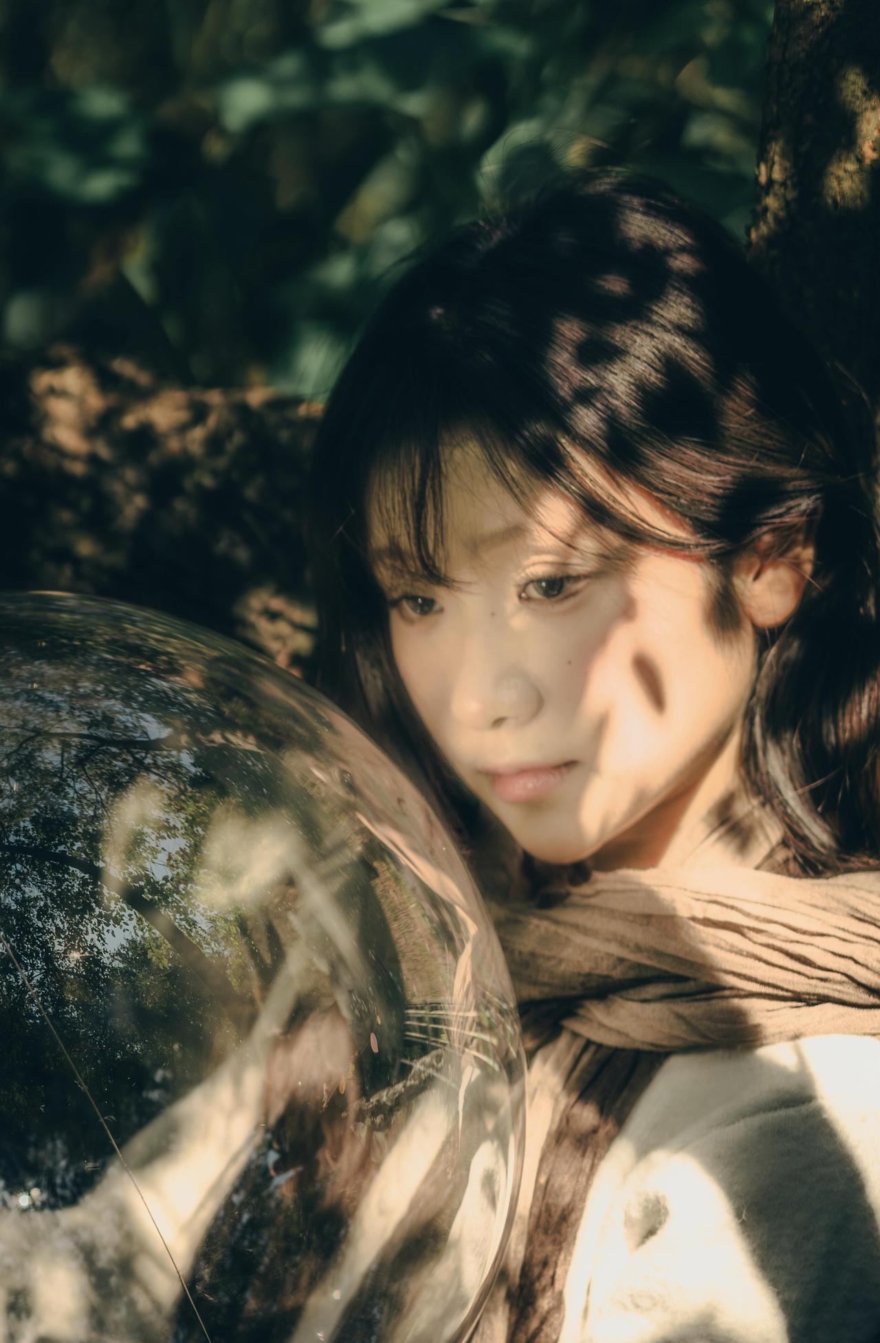 如果让你带着模特在树林里,你会怎样找光?并恰当利用现场的光影呢?午后的阳光透过树叶,在人物的脸颊和发丝上投下斑驳的光斑,形成了生动的“光绘”效果。人物侧身倚靠在树干上,眼神望向镜头,表情平静而略带疏离,与背景模糊的绿色形成了一种微妙的张力。 透明球体被放置在画面左侧,其表面清晰地反射出周围的环境,不仅丰富了画面层次,也巧妙地平衡了构图,避免了人物过于居中的单调感。色彩上,暖黄色的阳光与冷绿色的背景形成了和谐的互补,而人物的米白色毛衣与棕色围巾则作为中性色,起到了很好的过渡作用。 构图上,摄影师采用了近景特写,将人物的面部特征与情绪细节放大,让观众能够清晰地感受到她的内心世界。背景的虚化处理得当,既保留了环境的氛围感,又没有喧宾夺主。
