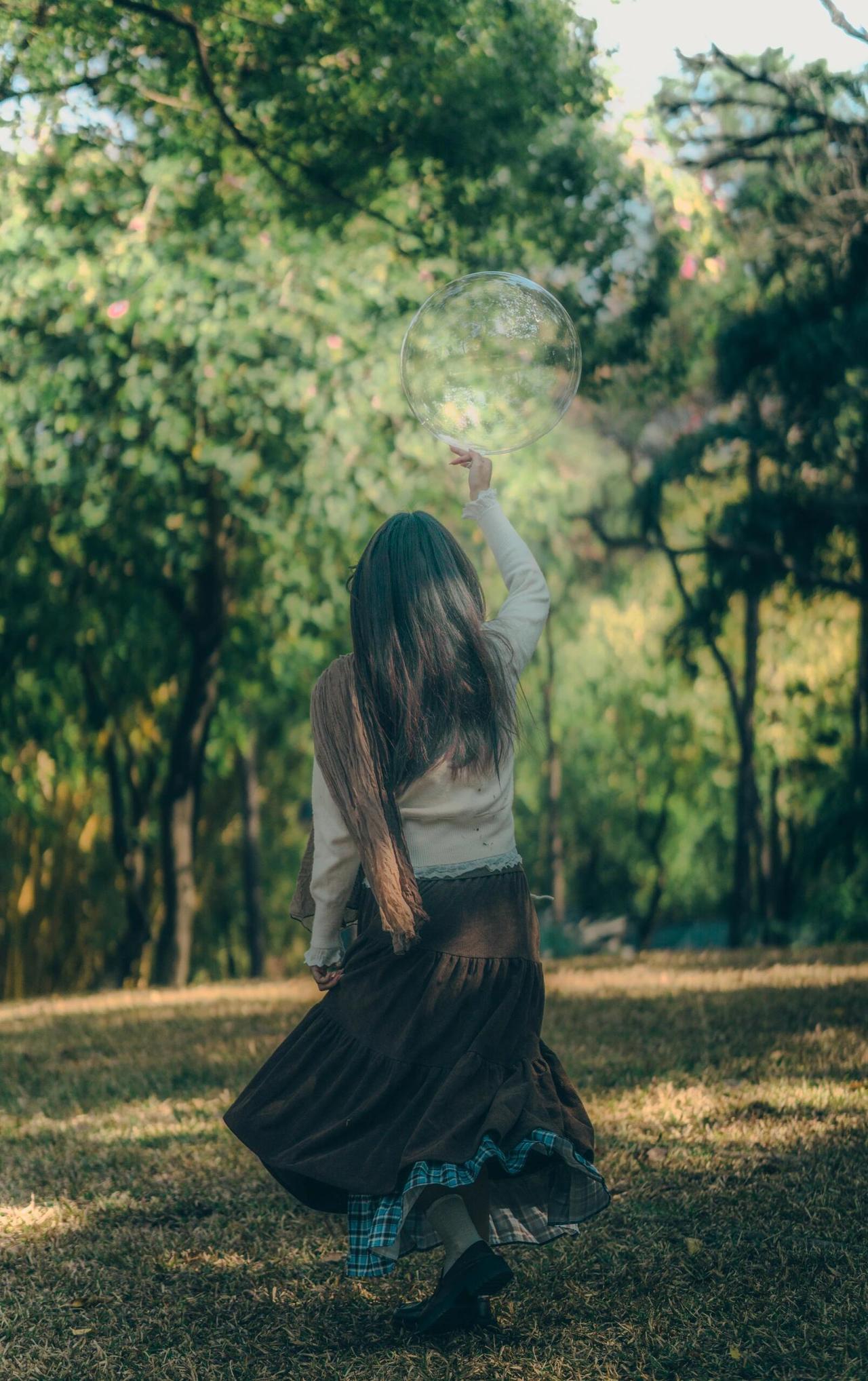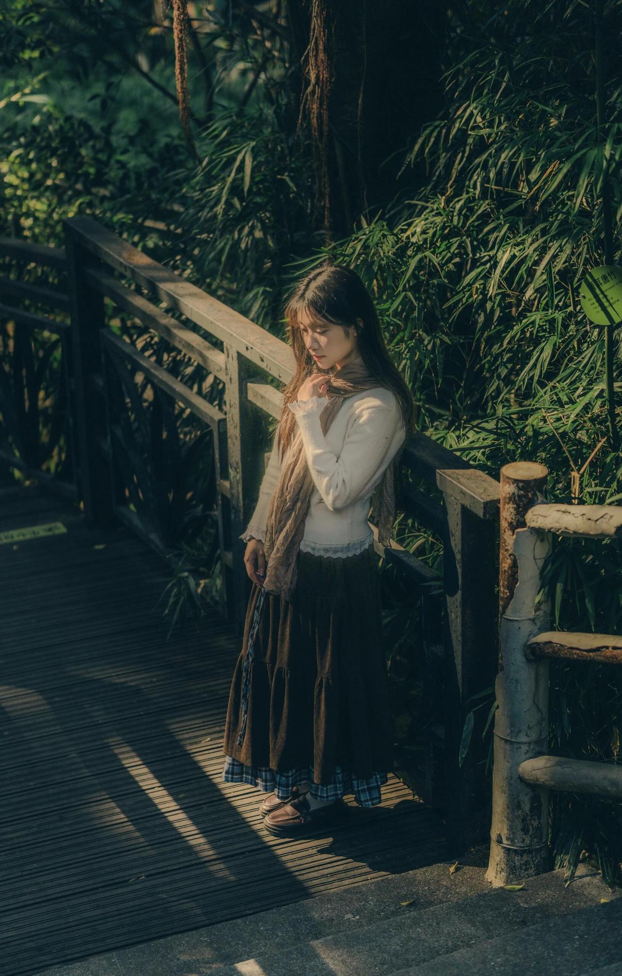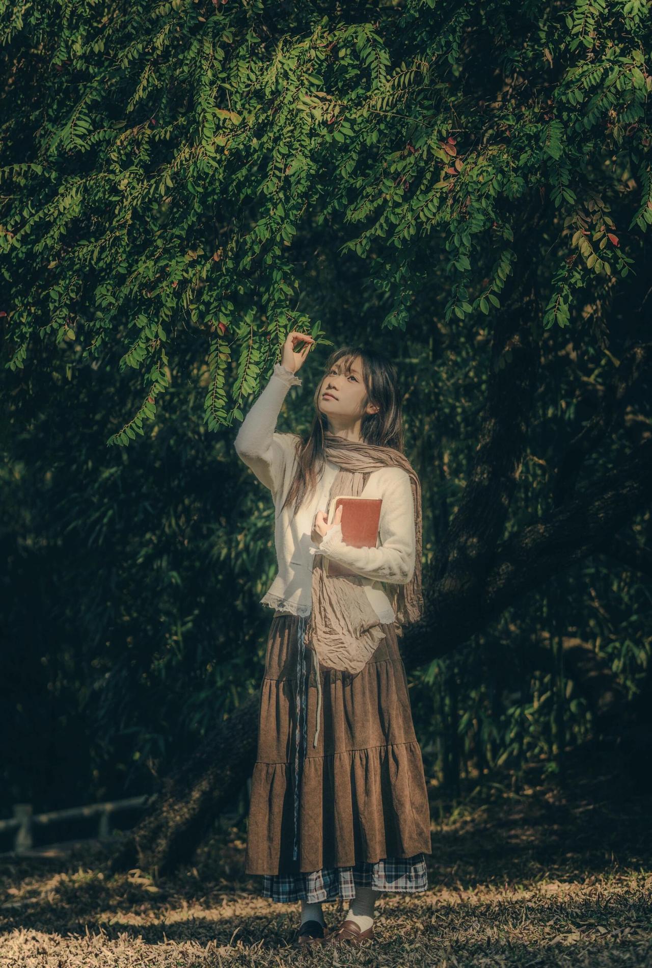 如果让你带着模特在树林里,你会怎样找光?并恰当利用现场的光影呢?午后的阳光透过树叶,在人物的脸颊和发丝上投下斑驳的光斑,形成了生动的“光绘”效果。人物侧身倚靠在树干上,眼神望向镜头,表情平静而略带疏离,与背景模糊的绿色形成了一种微妙的张力。 透明球体被放置在画面左侧,其表面清晰地反射出周围的环境,不仅丰富了画面层次,也巧妙地平衡了构图,避免了人物过于居中的单调感。色彩上,暖黄色的阳光与冷绿色的背景形成了和谐的互补,而人物的米白色毛衣与棕色围巾则作为中性色,起到了很好的过渡作用。 构图上,摄影师采用了近景特写,将人物的面部特征与情绪细节放大,让观众能够清晰地感受到她的内心世界。背景的虚化处理得当,既保留了环境的氛围感,又没有喧宾夺主。