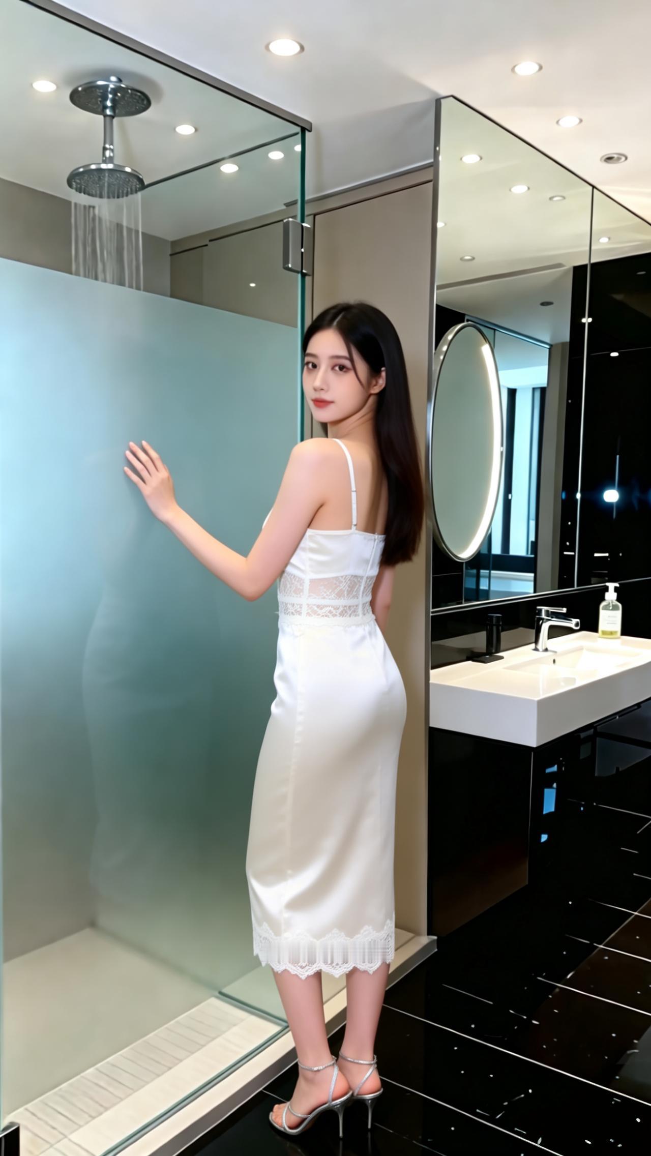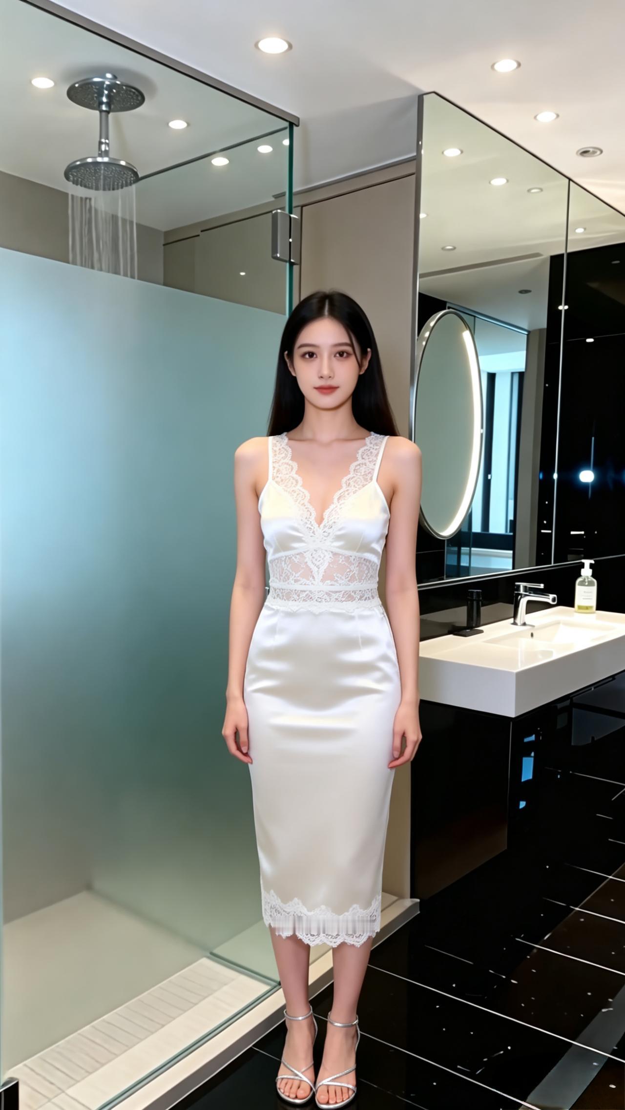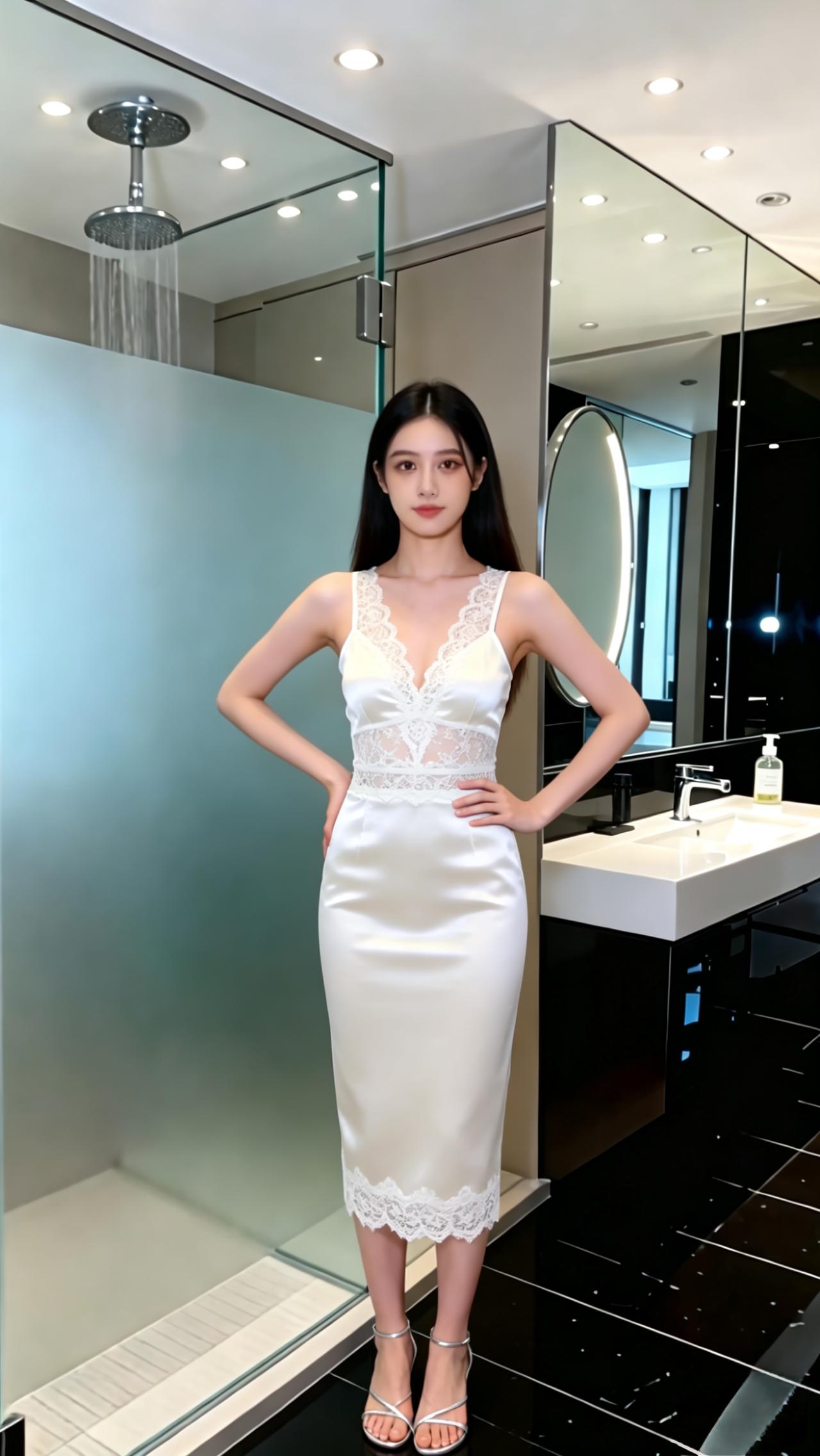 优雅的缎面连衣裙,米白光泽面料, 搭配精致蕾丝V领,收腰包臀。 配上银色细带凉鞋