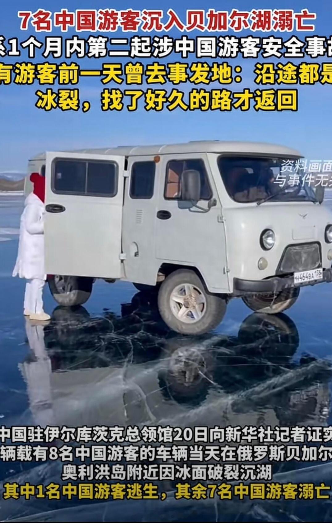 致7人溺亡的贝加尔湖旅游16888元起贝加尔湖冰面坠湖致7人溺亡 高端游背后藏致命风险当地时间2月20日,俄罗斯贝加尔湖奥利洪岛附近发生冰面坠车事故,一辆载有8名中国游客与1名俄罗斯司机的车辆因冰面破裂沉湖,仅1名中国游客逃生,7名同胞不幸溺亡。涉事行程为国内旅行社推出的贝加尔湖冬日奢游,8天7晚人均16888元起,主打蓝冰打卡与深度环岛。目击者称,车辆短短两三分钟便沉入湖中,冰面布满裂缝,风险早已显现。此次悲剧暴露出境外冰上项目违规通行、安全缺失的严重问题。美景之下暗藏杀机,出游务必把安全放在首位,远离无资质、高风险项目,莫用生命冒险。