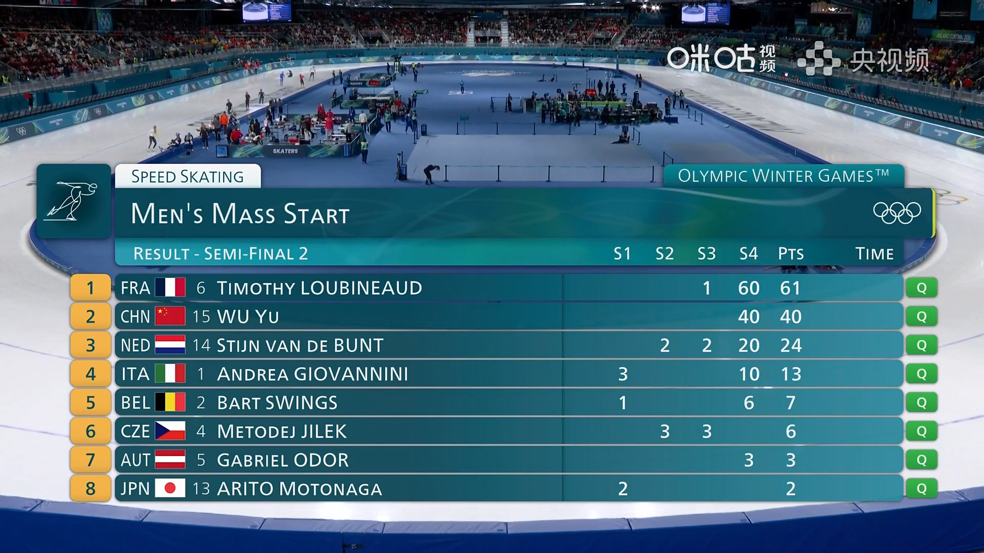 米兰冬奥会速度滑冰男子集体出发半决赛第二组,中国选手获得40积分,位列第二,闯入决赛。