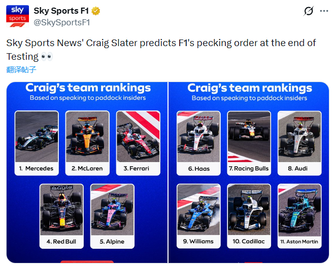 英国天空体育记者Craig Slater在巴林测试之后对于各支车队排序