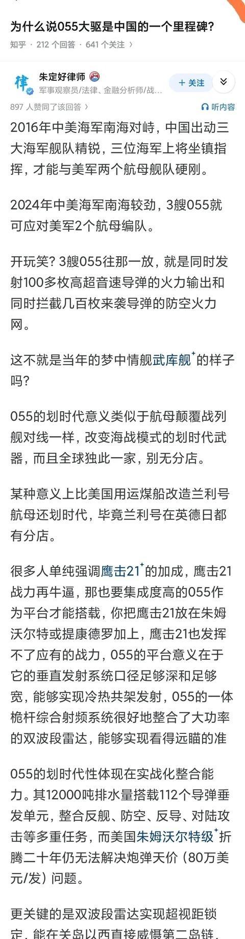 为什么说055大驱是中国的一个里程碑? 以前世界大战能打起来,是因为每个参战国都是制造大国。现在世界大战打不起来,是因为全世界就一个制造大国! 055型驱逐舰出来以后,很多军事圈的人直接把它叫做中国海军的里程碑,不是随便吹的。这玩意儿万吨级,综合性能放眼全球现役水面舰艇里排得上号,关键在于它代表了中国在高端军工体系上从跟跑到局部领跑的实际跨越。过去中国海军大型水面舰艇一直缺位,052系列、051系列再怎么改也填不满远洋作战的空白。055一出来,直接把这个短板补齐了,而且补得还挺彻底。 先说技术层面。055装备了112单元通用垂直发射系统,能打远程防空导弹、反舰导弹、对陆攻击导弹,甚至兼容高超音速武器。舰上用了双波段有源相控阵雷达,综合射频系统把多功能天线整合在一起,舰面不再像以前那样到处是雷达杆子,隐身效果也做得更扎实。动力系统是全燃联合动力,航速稳定在30节以上,续航力也够远海编队用。这些指标单拎出来不算独一无二,但把它们全部塞进一艘舰里,还批量造出来,这就不是简单堆料的问题了,而是整个工业链条的实力体现。 为什么说这是里程碑?因为055的出现证明了中国能独立完成从基础材料、关键元器件到系统集成的全流程。垂直发射单元的热发射和冷发射兼容、舰载电力分配网络、高功率相控阵的散热和抗干扰,这些东西以前中国基本靠进口或者合作,现在基本都能自产。配套企业涉及几千家,从特种钢、芯片、陀螺仪到电缆、涂料,全链条打通了。别的国家想造类似舰艇,经常卡在某一个环节上,比如配套企业跟不上,或者精密加工能力不足,最后只能降规格或者拖进度。 再往大里说,这艘舰折射出全球制造业格局的巨变。二战那会儿,为什么能打成世界大战?因为当时美、德、英、苏、日这些参战国个个都是制造大国,钢铁、机床、化工、电子全能自己搞,战时一转产就能海量下线坦克、飞机、军舰。现在情况完全变了。高科技武器复杂度指数级上升,一艘现代驱逐舰的配套清单能列几万页,涉及的工艺和供应链极长。 传统军事强国里,好多把低端制造业外包出去,船厂设备老化,工人技能断层,想突然扩产根本来不及。美国自己数据都摆在那,2024年他们民用大型海运船只一年才造6艘,中国是100多艘。军舰建造速度对比更明显,中美差距大概在6:1.8左右。这不是说美国不行了,而是他们的工业基础已经被掏空了一大块,短时间内没法恢复到能同时支撑多线高强度战争的水平。 中国不一样。完整的工业门类加上规模效应,让055能以比较快的节奏批量下水。首舰2017年下水,2020年入列,到现在已经有8艘左右服役,还有更多在建。这速度在全球范围内都算快的。批量服役以后,055直接成了航母编队里的骨干力量,防空反导、对海打击、对陆支援全能干,近海防御和远洋护航都站得住脚。保守点讲,如果只算常规武器对抗,在亚太区域范围内,中国海军靠现有力量打防御反击战,别人想占便宜很难。 以前多国工业大国并存,大家都能快速转入战时生产,互相消耗物资和产能,最后拼到一方崩溃。现在全球高端制造能力高度集中,只剩少数国家还能撑起完整的高科技军工链条。其他国家想打大仗,先得解决自己能不能造得出足够数量的精确制导武器、舰艇、飞机这些东西。造不出来,或者造得太慢太少,那仗就没法打成过去那种全面动员的规模。055的批量出现,就是这个现实的一个缩影:制造能力决定战争潜力,而制造能力现在已经不是均匀分布了。 当然,055也不是完美无缺,未来还要面对更新的威胁,比如高超音速武器扩散、无人平台大规模应用这些。但至少在当下,它把中国海军从“能近海自保”推到了“能远洋体系作战”的台阶,这一步跨得实打实。很多人平时不关注军事,觉得中国海军还是老样子,其实低头看看055的服役进度和性能参数,就知道差距已经拉开了。低调归低调,实力摆在那,谁也抹不掉。
