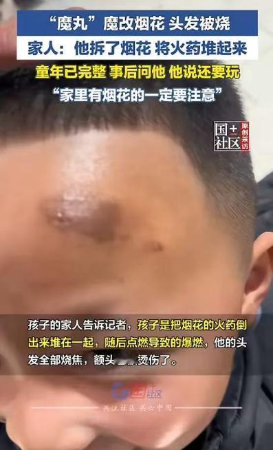 “太吓人了!”2月8日,四川宜宾,一男童趁家长不注意,把烟花的火药倒出来,堆在一起,点燃后瞬间发生爆炸,男孩头发全烧焦,额头也被烫伤,更离谱的是,家长事后问他还玩不玩,男孩竟然说还想玩!网友:多大瘾啊! 正是寒假期间,很多孩子都在家闲着,四川宜宾的这个小男孩,也趁着回老家的机会,吵着要爷爷给零花钱买烟花。 爷爷奶奶平时就比较宠他,拗不过孩子的要求,就给了他一些零钱,让他去买了几支自己喜欢的烟花。 拿到烟花后,小男孩特别开心,一开始还按照正常的方式燃放,看着烟花喷出漂亮的火花,他觉得十分有趣。 可玩了一会儿,他就不满足于这样的玩法了,脑子里冒出了一个奇怪的想法,要是把好几支烟花的火药都倒出来堆在一起点燃,会不会喷出更漂亮、更壮观的火花。 当时家长们都在屋里忙着准备年货,没人留意院子里的小男孩,正是趁着这个空隙,他蹲在院子的角落里,小心翼翼地把每一支烟花都拆开,把里面的黑色火药一点点倒在地上,还特意用小棍子把火药捣实,堆成了一个小小的土堆,满心期待着点燃后的效果。 一切准备好后,小男孩拿出打火机,毫不犹豫地点燃了堆在一起的火药。 可他根本不知道,这种行为有多危险,火药被点燃的瞬间,就发生了剧烈的爆炸,一股高温热浪扑面而来,伴随着刺耳的声响,吓得小男孩当场愣在原地,根本来不及躲闪。 爆炸声惊动了屋里的家长,他们赶紧冲了出来,一看院子里的景象,瞬间就慌了神。 小男孩的头发被爆炸的火焰烧焦,一缕一缕地贴在头皮上,额头也被烫伤,出现了一块黑印,脸上还沾着一些火药的粉末,看起来十分狼狈,也让人十分心疼。 家长们赶紧跑过去查看小男孩的伤势,万幸的是,只是皮外伤,没有伤到眼睛和其他要害部位,这才稍稍松了口气。 看着孩子受伤的样子,家长又心疼又生气,一边给他处理伤口,一边顺嘴问他,经历了这样的事,以后还敢不敢再玩这种危险的玩法,还想不想玩烟花了。 让人万万没想到的是,小男孩根本没有意识到自己的行为有多危险,也没有因为受伤而感到害怕,反而笑着说还想玩。 听到这句话,家长们又气又无奈,一时之间不知道该说什么才好。他们怎么也想不通,刚刚经历过爆炸、被烧伤的孩子,竟然对这种危险的玩法没有丝毫敬畏之心。 后来,这件事被家长拍成视频,分享到了网上,很快就引来了无数网友的围观和热议。 网友们看到小男孩烧焦的头发和受伤的额头,都觉得十分揪心,同时也忍不住吐槽,纷纷留言说“多大瘾啊”; 还有网友表示,这孩子真是不知危险,还好没有造成更严重的伤害,也有网友提醒家长,一定要加强对孩子的安全教育,不能再这么疏忽大意了。 其实,每年过年期间,都会有孩子因为玩烟花、鞭炮而受伤的事情发生,大多都是因为家长疏忽看管,加上孩子不懂危险、对烟花的危害没有正确的认知。 很多孩子觉得烟花好玩、刺激,却不知道,一旦操作不当,就可能酿成无法挽回的悲剧。 这个四川宜宾的小男孩,无疑是幸运的,只是受了点皮外伤,但他的经历也给所有家长提了个醒,一定要重视孩子的安全教育,看好自己的孩子,避免类似的危险再次发生。