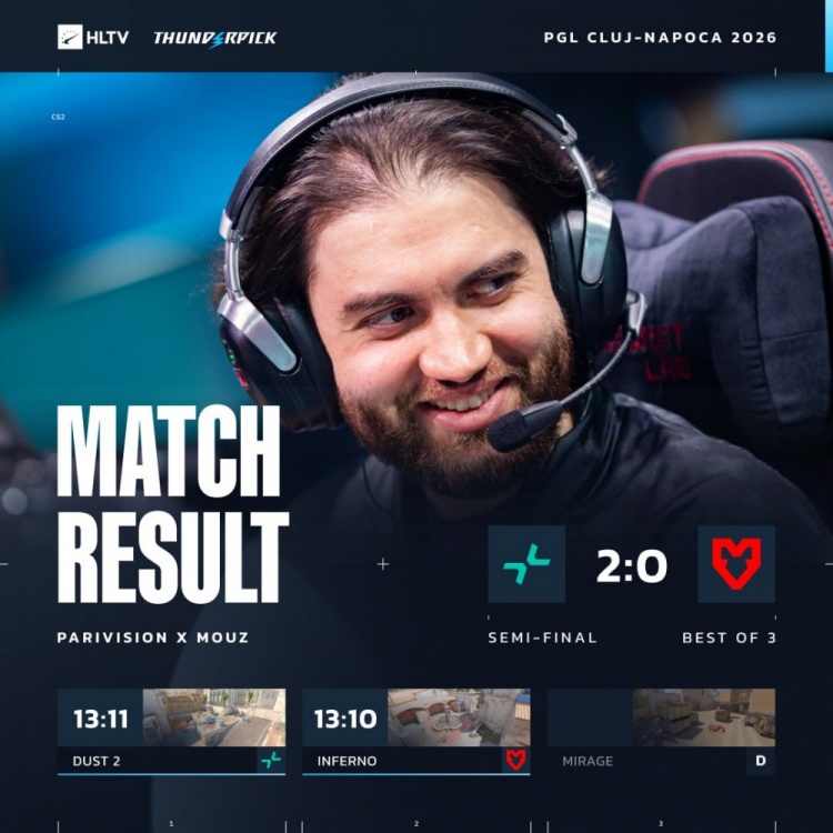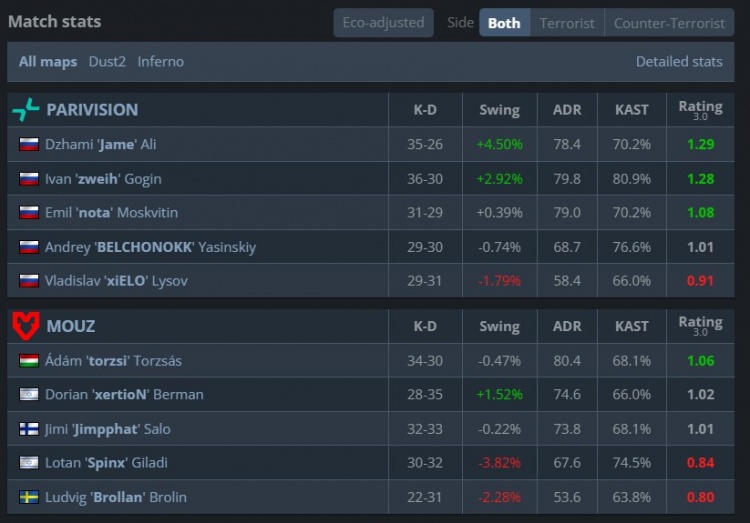 易边再战,手枪局A平台对枪,Brollan与xertion各取双杀拿下手枪局。次回合PV纯E让比分被扳平。长枪回合MOUZ冲B得手,小吉米与Brollan各取双杀反超比分后再拿一分。再到长枪局,nota铁血守A与队友识破MOUZ夹A战术拿到第8分。
