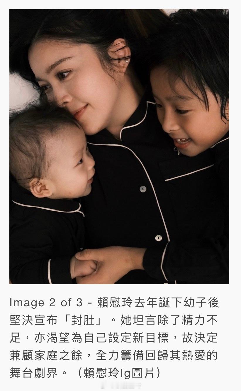 賴慰玲去年誕下幼子,她被問及會否考慮追生一個女兒時堅決表示:「已經足夠了,不會再生!『封肚』!我確實曾考慮過追生女兒,但誰能保證下一胎一定是女孩?而且我開始察覺到自己不夠精力。再者,除了兼顧家庭,我也渴望為自己設定新目標。自加入電視台後,我已很久沒有接觸舞台劇,實在太想念那個舞台了!每當觀賞舞台劇時,我總會想:何時才輪到自己?我絕對不會讓自己等太久!很快就會有消息!請相信我!」賴慰玲在誕下第二胎後決定「封肚」的另一主因,正是為了展開人生的下半場,全力籌備回歸她熱愛的舞台劇界。