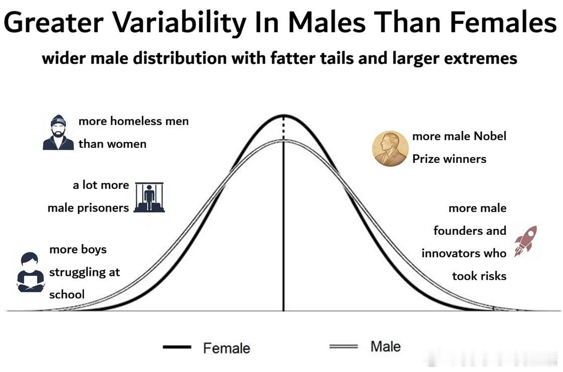 快速阅读:为什么顶级国际象棋选手、发明家和诺贝尔奖得主95%是男性,而囚犯和流浪汉中75-90%也是男性?答案在于男性在几乎所有特质上都表现出更大的变异性——这意味着男性更容易出现在分布曲线的两端,既产生天才,也制造灾难。