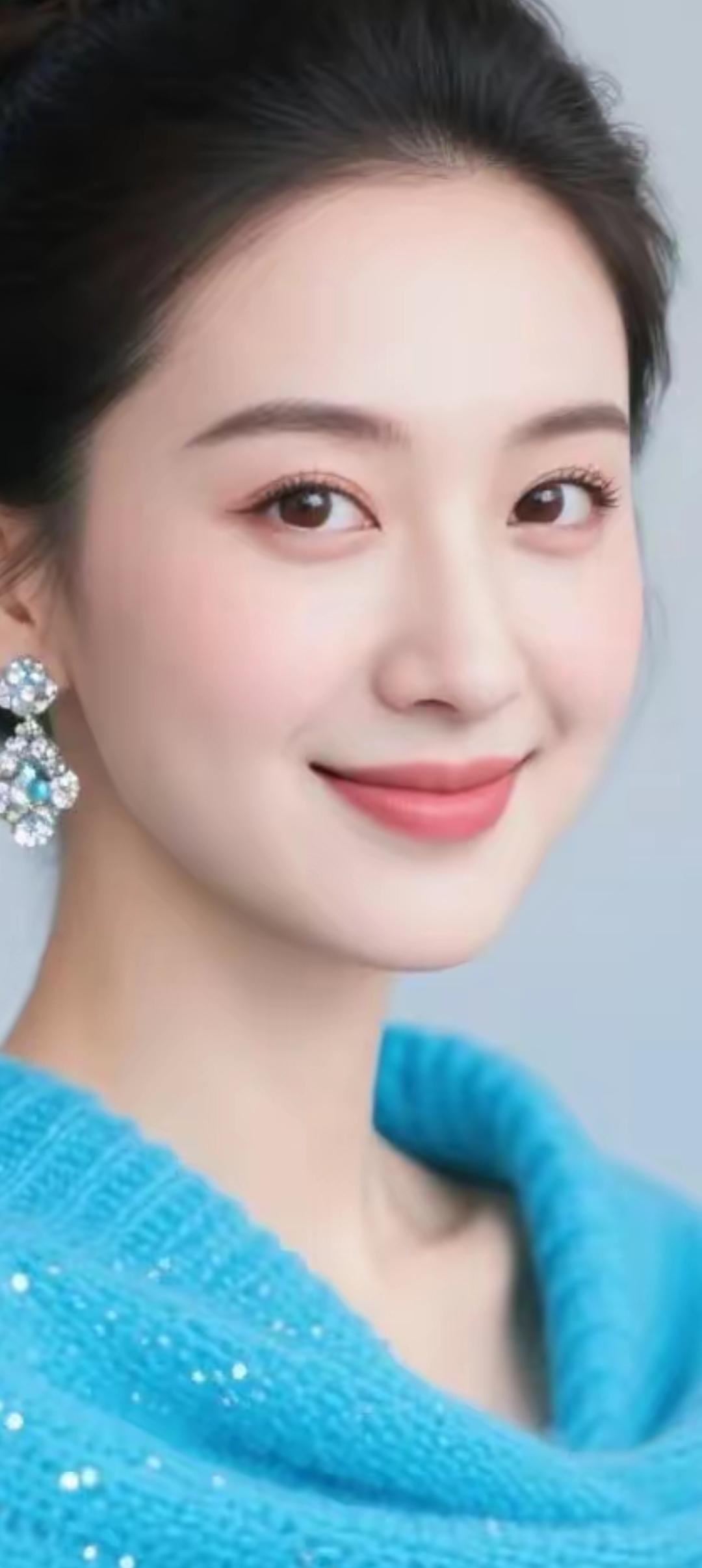 冬日暖阳下的温柔微笑,蓝毛衣与闪亮耳环的完美搭配。