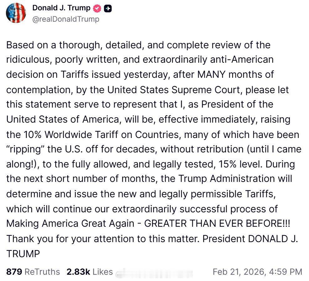 一觉醒来特朗普改新打法了 美国总统特朗普今天宣布,在最高法院作出他所称的“反美”裁决后,将全球关税税率立即从 10% 提高至 15%。