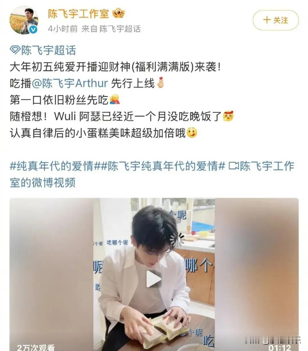 陈凯歌儿子,太狠了! 陈飞宇一个月只吃15顿饭!上热搜的身材管理,藏着演员的“狠”劲 2月21号陈飞宇凭“自律”冲上热搜,但这次不是因为他爸陈凯歌,也不是因为新剧绯闻,而是因为他对自己太“狠”了 。 刚看到一个数据惊到我了:为了新剧《纯真年代的爱情》,这小伙子居然整整一个月没吃晚饭。算下来,整个月的正餐加起来才吃了15顿 。 这是什么概念?咱们平常一天三顿都不一定能管住嘴,人家直接把晚餐戒了。难怪最近镜头里的他,下颌线利落得像开了特效,整个人清瘦得只剩少年感 。 视频里有个细节特别戳人——在片场看到蛋糕时,他小心翼翼尝了一小口,那瞬间的笑容比AK还难压 。还念叨着“要把这个带回去给哥哥”,这孩子是真把食物当奢侈品了 。 其实了解他的老粉都知道,这不是第一次“自虐式”减肥。15岁时他也曾是个220斤的“肥滑腻”小胖墩,后来硬是靠跑步半年甩掉90斤,才有了现在的撕漫男神轮廓 。 说实话,明星为了角色饿肚子是敬业,但咱们普通人真别学。工作室也说了,健康永远是第一位 。 2月21号晚他的新剧正好开播,看到白衬衫、清瘦脸、眼神干净的方穆扬,大概就能明白——那些咽下去的口水,最后都变成了角色身上的光 。