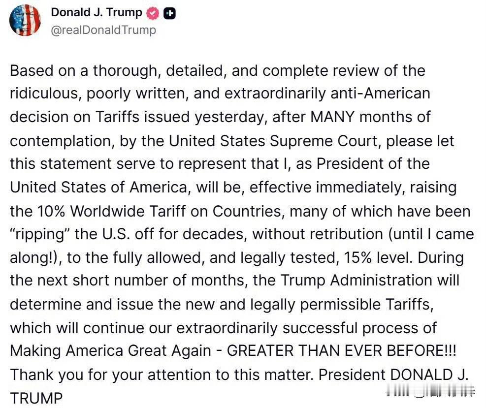 一觉醒来特朗普改新打法了,美国总统特朗普今天宣布,在最高法院作出他所称的“反美”裁决后,将全球关税税率立即从 10% 提高至 15%。 “针对美国最高法院在“闭门思索”数月后于昨日发布的裁决,我已进行了全面、深入且详尽的审查。该裁决不仅荒唐透顶、文理不通,而且极度“反美”。 因此,我现以美国总统的身份特此声明:即刻起,将针对全球各国的关税比例从10%上调至法律允许且经过验证的15%最高水平。 过去几十年来,这些国家中的许多都在肆无忌惮地占美国便宜,且从未付出代价(直到我的出现!)。 在接下来的几个月内,川普政府将确定并发布新的合法关税,继续推进我们那极其成功的进程——让美国再次伟大,且比以往任何时候都更加伟大!!! 谢关。”特朗普征加关税 川普特朗普