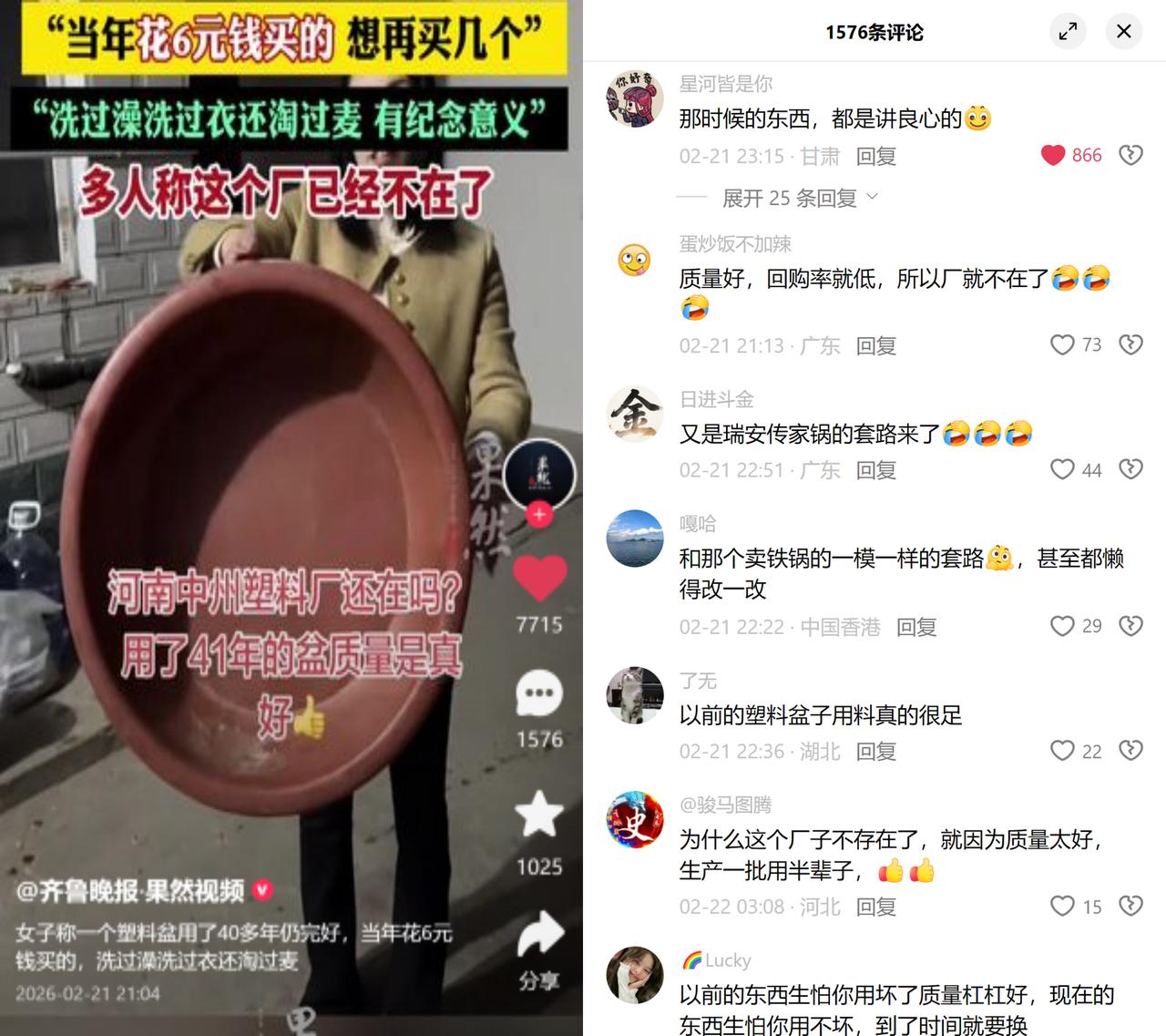 40年不烂的塑料盆! 河南周女士晒家里的老塑料盆:1984年花6元买的,洗过澡淘过麦,用了40多年还没坏,想回购却找不到当年的厂子了。 别再说当年商家有良心了!这哪是良心?是钱逼的!1984年6元是城镇职工月薪的1/10,相当于现在你花大几百上千买个盆!那时候塑料是金贵材料,产量低、成本高,做不耐用谁敢买?不得赔得底朝天? 现在的塑料盆几块钱一个,资本玩的就是计划性报废!就不让你用太久,坏了再买才能反复赚钱!当年的耐用是高价倒逼的刚需,现在的易坏是低价催生的快替换逻辑。 有人说厂子倒闭是因为质量太好,说白了是老玩法跟不上新套路了,现在谁还靠卖一个盆赚半辈子的钱?都是赚你一次又一次的复购!你怀念老国货,本质是怀念那种花一份钱能踏实用一辈子的安全感,可资本偏不让你有啊!