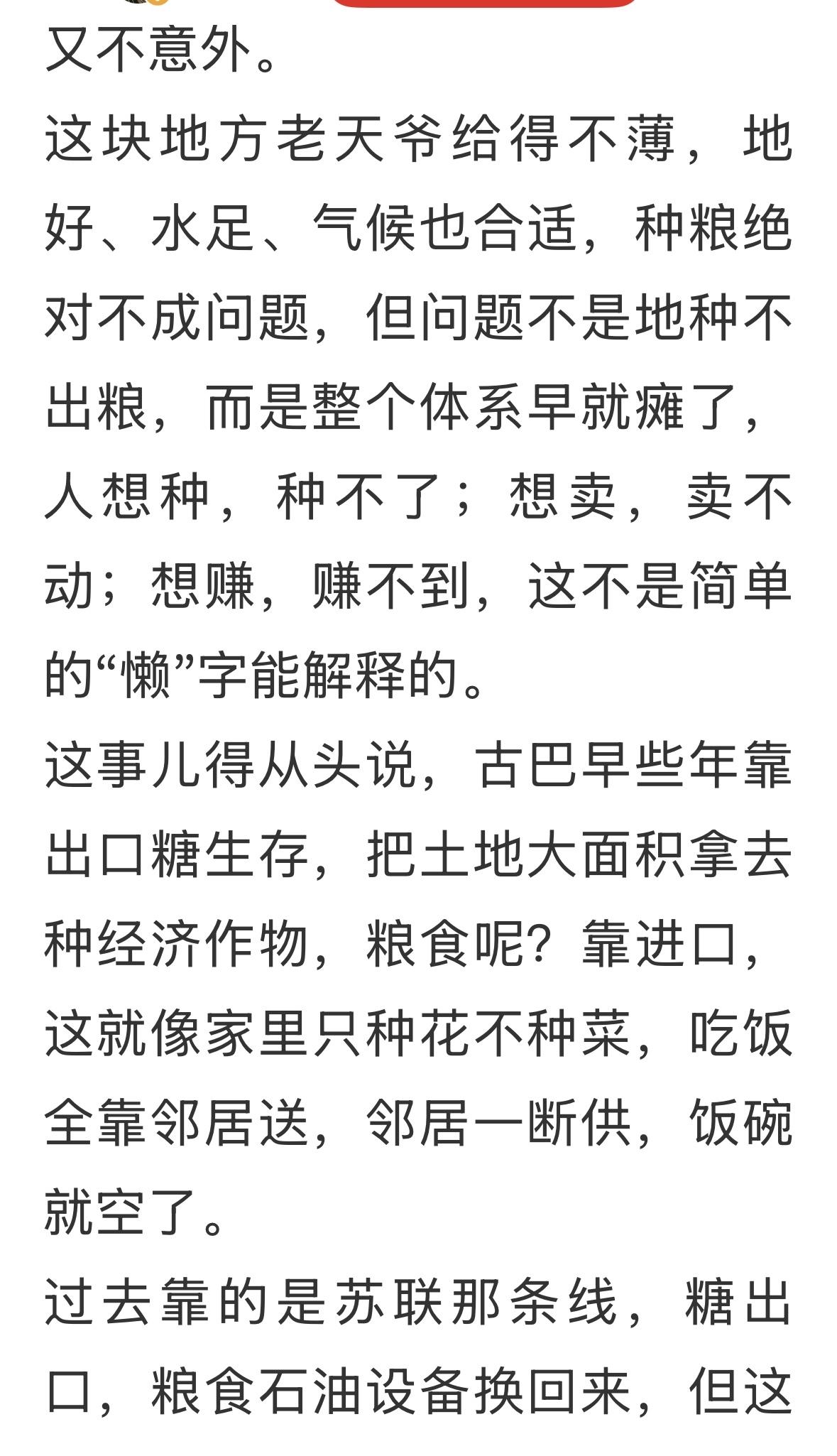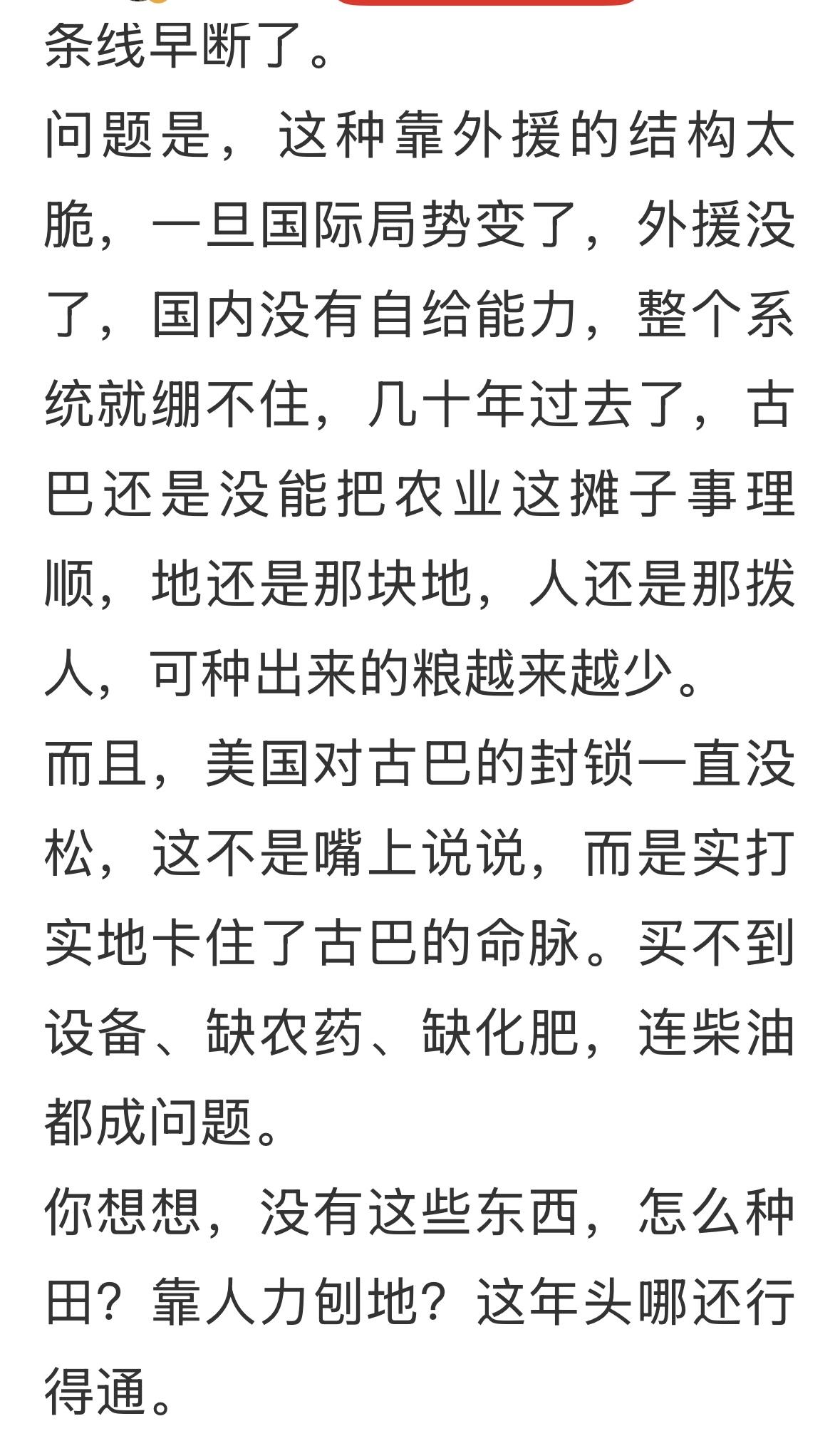 用户13xxx13 23 2026-02-22 08:20 古巴人民不是不种地,而是没有时间种地,人家国家在领导人的带领下年年反美,月月反美,天天反美,时时反美,哪有时间种地啊,只有反美解决,就有人援助粮食,援助石油……