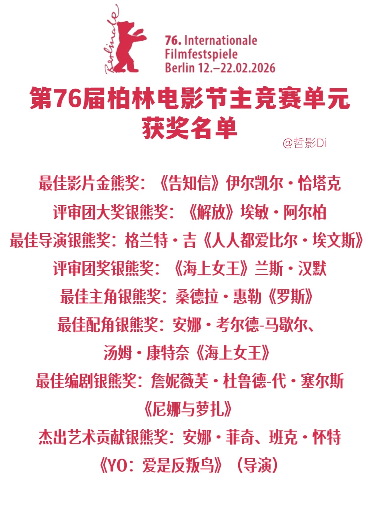 第76届柏林电影节 主竞赛单元获奖名单公布,伊尔凯尔·恰塔克执导的土耳其影片《告知信》获得本届金熊奖,英国影片《海上女王》则获得评审团奖、最佳配角两项大奖。桑德拉·惠勒、汤姆·康特奈分别凭借《罗斯》《海上女王》二封柏林演员奖。具体获奖名单如下↓ ↓ ↓