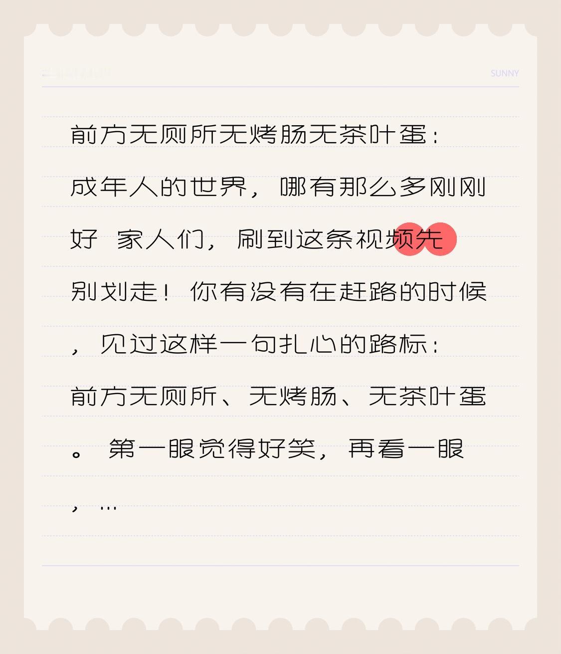 前方无厕所无烤肠无茶叶蛋:成年人的世界,哪有那么多刚刚好 家人们,刷到这条视频先别划走!你有没有在赶路的时候,见过这样一句扎心的路标:前方无厕所、无烤肠、无茶叶蛋。 第一眼觉得好笑,再看一眼,突然就沉默了。 这不就是我们大多数人的人生吗? 小时候总以为,人生路上到处都是热水、零食、歇脚点,饿了有吃的,累了有地方躲,想要的东西伸手就能拿到。就像出门旅游,渴了有水,饿了有烤肠,累了有厕所,一切都安排得妥妥当当。 可走着走着我们才发现,真正的人生路,根本不是旅游景区。 更多的时候,是前不着村,后不着店。 没有随时能歇脚的厕所,没有暖胃的茶叶蛋,没有解馋的烤肠,甚至连一口热乎水,都得自己带。 很多人看到这句话会笑,觉得就是一句普通的提示语。可只有真正扛过生活的人,才懂里面藏着的无奈。 我们总期待生活处处有依靠,遇事有人兜底,难过有人安慰,缺钱有人帮忙。可现实是:难走的路,得自己走;扛不住的压力,得自己扛;没人撑腰的日子,得自己咬牙撑过去。 没有烤肠,就自己准备干粮;没有茶叶蛋,就自己带热水;没有厕所,就学会忍耐和规划。人生这条路,本就是单枪匹马,本就是自带装备,才能走得长远。 其实生活从来不会对你格外温柔,但它会悄悄奖励那些不抱怨、不依赖、自己撑伞的人。 前方无厕所无烤肠无茶叶蛋,不是生活在为难你,而是在告诉你:该独立了,该成长了,该靠自己了。 致每一个正在赶路的普通人: 愿你即使前路没有补给,也能自带光芒; 即使无人依靠,也能顶天立地; 即使一路风雨,也能走到春暖花开。 生活没有那么多“刚刚好”,但你可以把日子,过得越来越棒! 点赞收藏,愿我们都能在无人依靠的路上,活成自己的靠山!