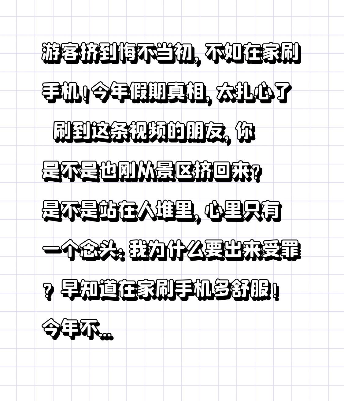 游客挤到悔不当初,不如在家刷手机!今年假期真相,太扎心了 刷到这条视频的朋友,你是不是也刚从景区挤回来?是不是站在人堆里,心里只有一个念头:我为什么要出来受罪?早知道在家刷手机多舒服! 今年不管是春节、小长假还是周末,全国景区都在上演同一幕:人山人海,寸步难行。高速堵成停车场,景点挤成罐头盒,上厕所排队一小时,看风景全靠别人后脑勺,吃饭被涨价,拍照全是人,一天走下来腿都废了,心情越玩越累。 很多人出门前满怀期待,想着看山看海看风景,拍几张美美的照片发朋友圈。可真正到了地方才发现,风景没看着,人看了个够;放松没做到,累得怀疑人生。不少游客当场后悔:花钱买罪受,早知道躺家里吹空调、刷视频、吃零食,比这强一百倍! 但你有没有想过,我们为什么会一边后悔,一边又忍不住出门? 我们总以为,出门才算过节,远行才有意义,不去网红景点打卡,就好像辜负了假期。可我们忘了,旅行的意义从来不是挤、不是赶、不是打卡,而是舒服、放松、开心。 真正的假期,不是非要去远方。在家陪陪家人,做一顿爱吃的饭,睡个自然醒的懒觉,安安静静刷会儿手机,不用赶时间,不用看人流,不用受委屈,这种轻松自在,比挤在景区里难受一天,幸福太多了。 风景再好,比不上心情好;名气再大,不如舒服自在。 越来越多人开始醒悟:高质量的休息,不是人挤人的旅行,而是让自己真正放松下来。不必跟风凑热闹,不必为了面子硬出门,怎么开心怎么过,才是假期最正确的打开方式。 当然,不是说不能出门旅行,而是别赶在最挤的时候,去最火的地方,遭最大的罪。错峰出行、小众游玩、轻松自在,比硬挤网红景点强太多。 屏幕前的你,这个假期是出门挤成了“肉饼”,还是在家舒舒服服躺平? 其实不管选择哪种方式,自己开心、舒服、不后悔,就是最好的假期。 别再为了打卡而疲惫,别再为了面子而将就。人生很短,假期很贵,与其挤到悔不当初,不如安心享受当下。 愿我们都能放下焦虑,不跟风、不盲从,过一个真正属于自己的、轻松又幸福的假期! 点赞说说,你是出门旅游了,还是在家快乐刷手机?