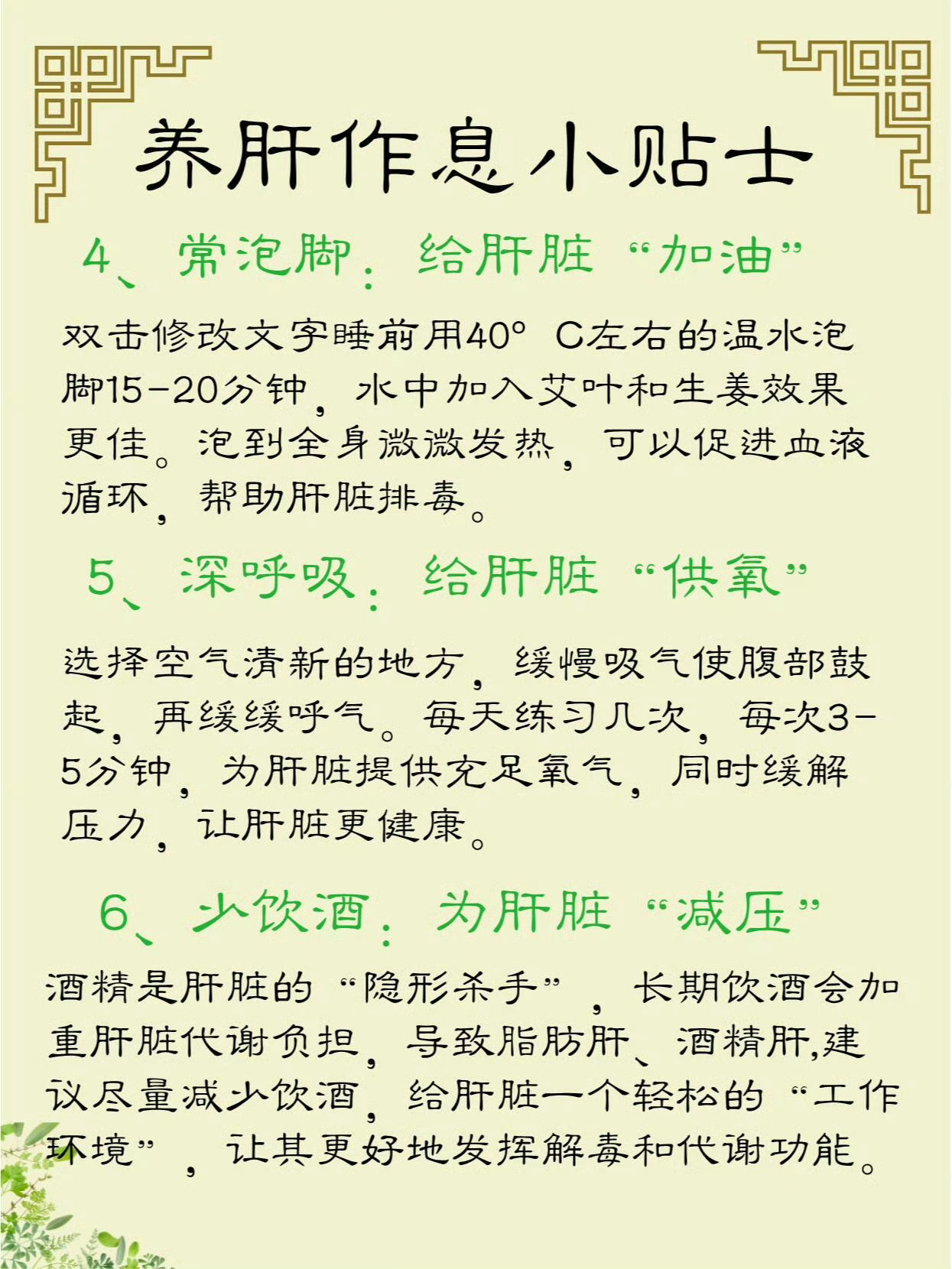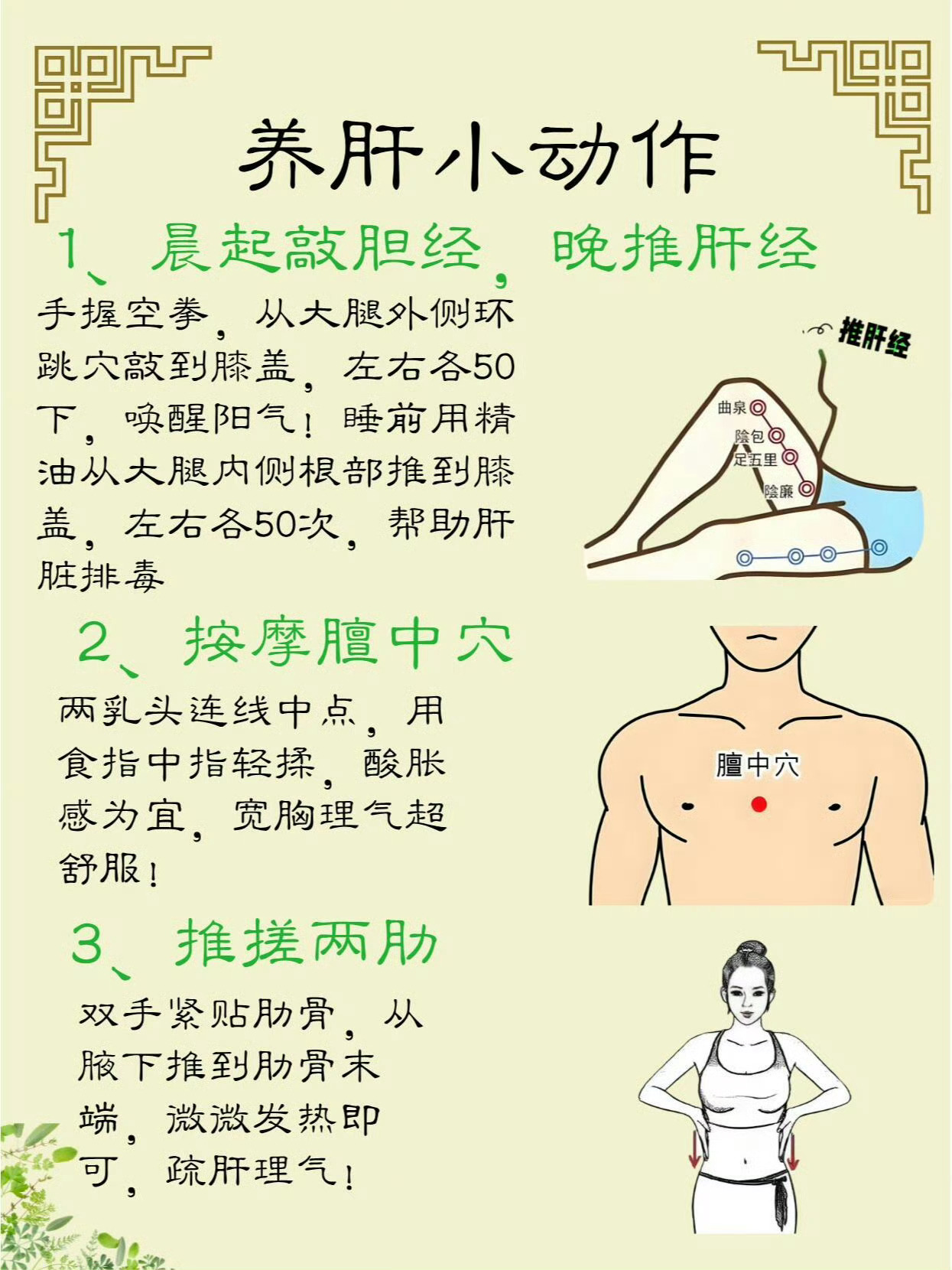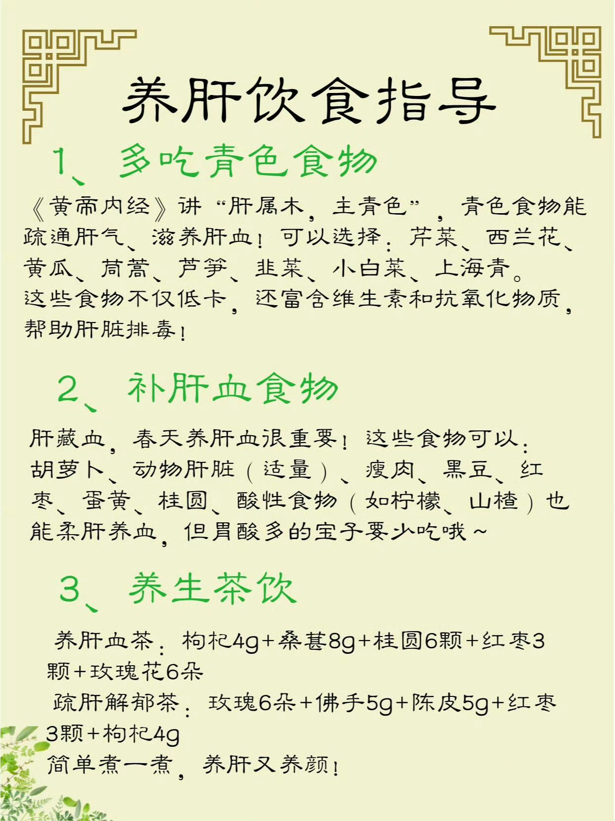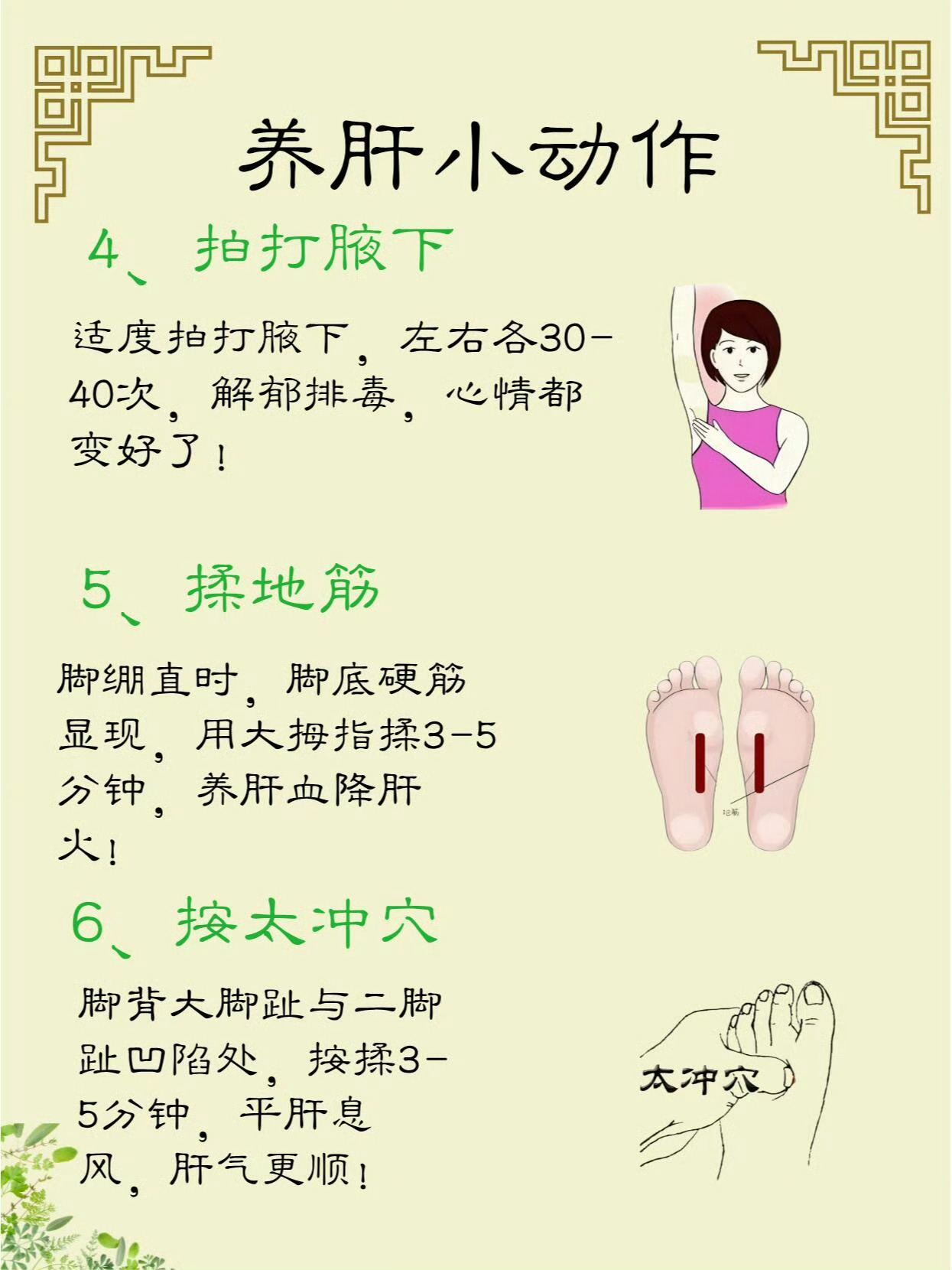 《黄帝内经》说:“春三月,此谓发陈,天地俱生,万物以荣。”春天是万物复苏的季节,也是养肝的黄金期!趁着阳气升发,赶紧抓住机会,开启你的养肝计划吧!💪🥗养肝饮食指南1️⃣ 多吃青色食物 《黄帝内经》讲“肝属木,主青色”,青色食物能疏通肝气、滋养肝血!建议以下食物:✅ 芹菜、西兰花、黄瓜、茼蒿、芦笋、韭菜、小白菜、上海青 这些食物不仅低卡,还富含维生素和抗氧化物质,帮助肝脏排毒!2️⃣ 补肝血食物 肝藏血,春天养肝血很重要!这些食物安排上:✅ 胡萝卜、动物肝脏(适量)、瘦肉、黑豆、红枣、蛋黄、桂圆 酸性食物(如柠檬、山楂)也能柔肝养血,但胃酸多的宝子要少吃哦~3️⃣ 养生茶饮🍵 养肝血茶:枸杞4g+桑葚8g+桂圆6颗+红枣3颗+玫瑰花6朵🍵 疏肝解郁茶:玫瑰6朵+佛手5g+陈皮5g+红枣3颗+枸杞4g 简单煮一煮,养肝又养颜!🧘♀️养肝小动作1️⃣ 晨起敲胆经,晚推肝经 手握空拳,从大腿外侧环跳穴敲到膝盖,左右各50下,唤醒阳气! 睡前用精油从大腿内侧根部推到膝盖,左右各50次,帮助肝脏排毒~2️⃣ 按摩膻中穴 两乳头连线中点,用食指中指轻揉,酸胀感为宜,宽胸理气超舒服!3️⃣推搓两肋 双手紧贴肋骨,从腋下推到肋骨末端,微微发热即可,疏肝理气!4️⃣ 拍打腋下 适度拍打腋下,左右各30-40次,解郁排毒,心情都变好了!5️⃣揉地筋 脚绷直时,脚底硬筋显现,用大拇指揉3-5分钟,养肝血降肝火!6️⃣ 按太冲穴 脚背大脚趾与二脚趾凹陷处,按揉3-5分钟,平肝息风,肝气更顺!💤养肝作息小贴士🌙 早睡养肝:23点前入睡,肝脏修复黄金期!🛌 侧卧减负:右侧卧减轻肝脏压力~💆♀️ 梳头开路:每天梳头100下,帮助头部血液循环!🦶 泡脚加油:睡前泡脚15分钟,加点艾草或生姜,驱寒又养肝!🌬️ 深呼吸供氧:每天深呼吸5分钟,增加氧气摄入,帮助肝脏代谢!🍷少饮酒:避免过量饮酒,给肝脏一个轻松的“工作环境”,让其更好地发挥解毒和代谢功能。🌟养肝就是养命!趁着春天,赶紧行动起来吧!肝脏养好了,气血足了,年轻态自然来!💃我是武医张鹏 ,跟着我一起轻松养生,乐享健康每一天!国医的精诚力量健闻登顶计划