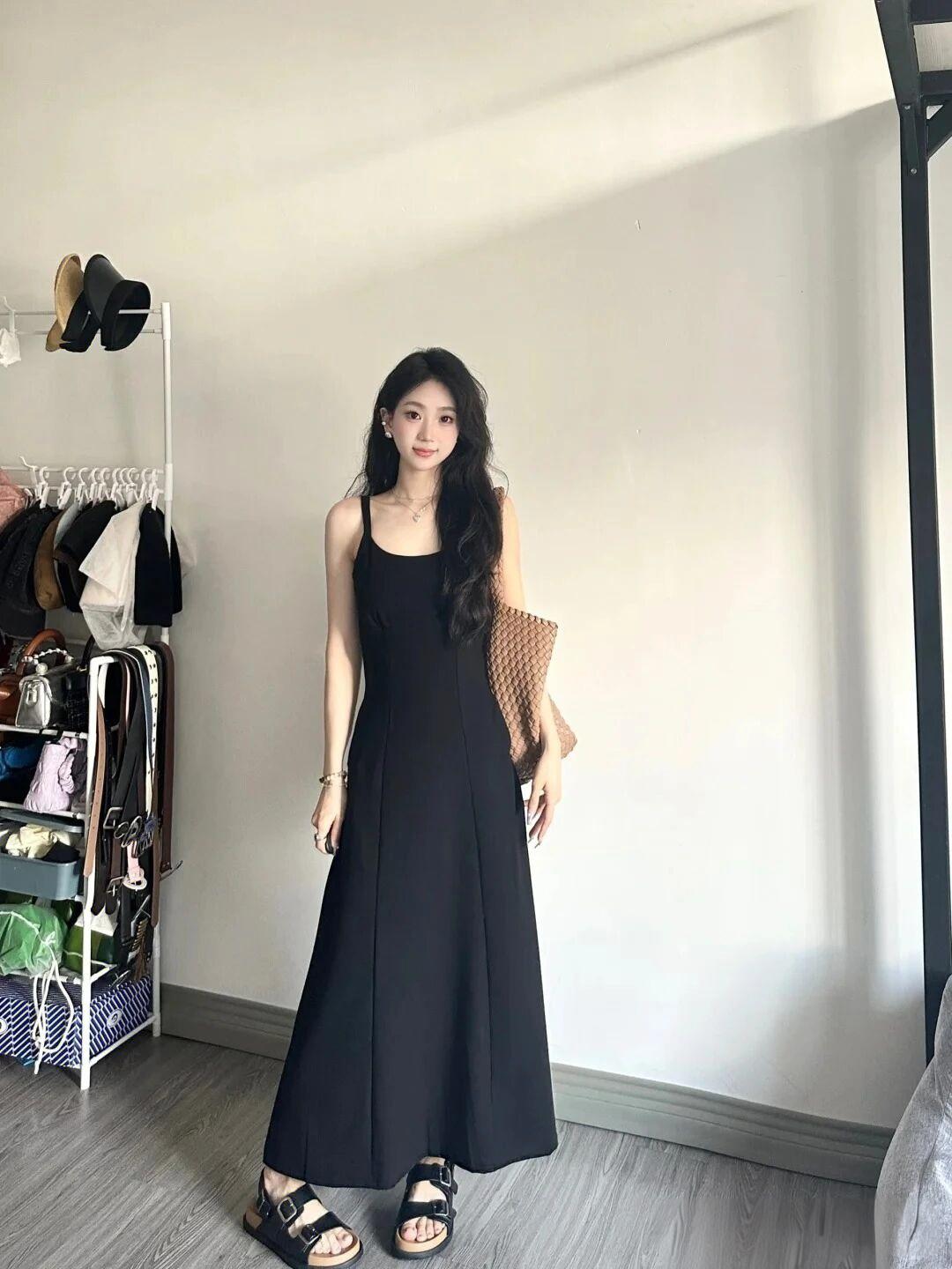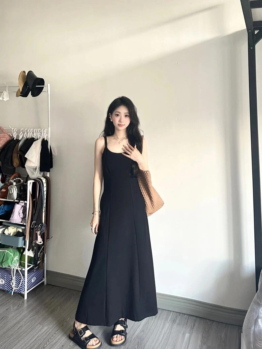 简约优雅,黑色长裙搭配草编包,轻松出街黑色系带连衣裙