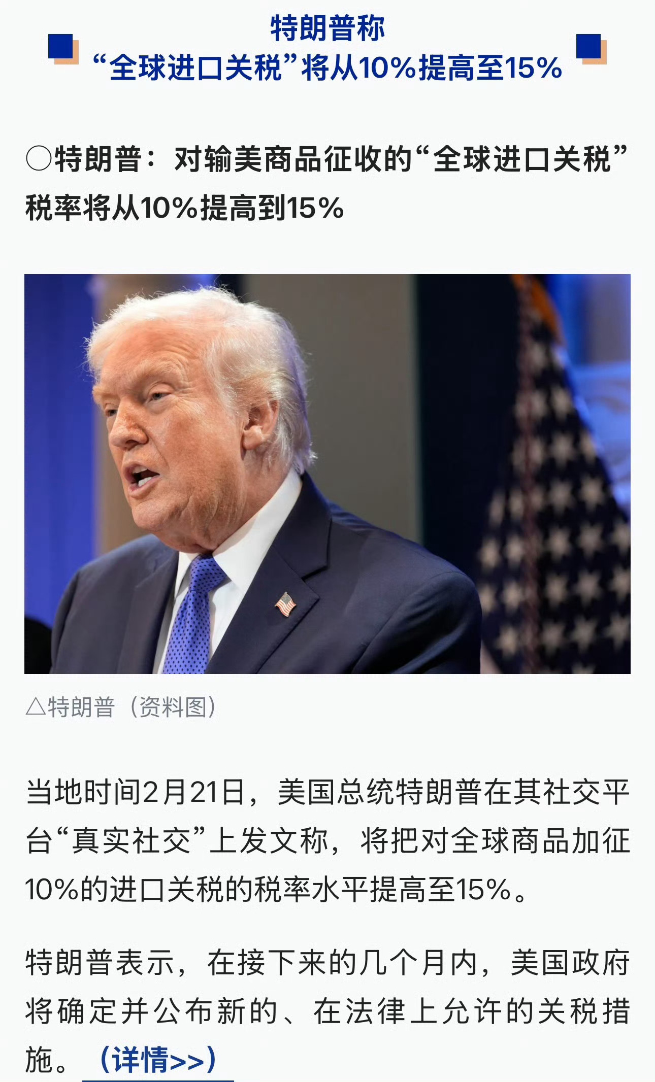 特朗普把全球输美关税升至15%数百家公司起诉要求美国退税最高法院刚裁定关税违法,特朗普转头就把全球输美关税从10%强行上调至15%,全然无视法律裁决与国际规则。