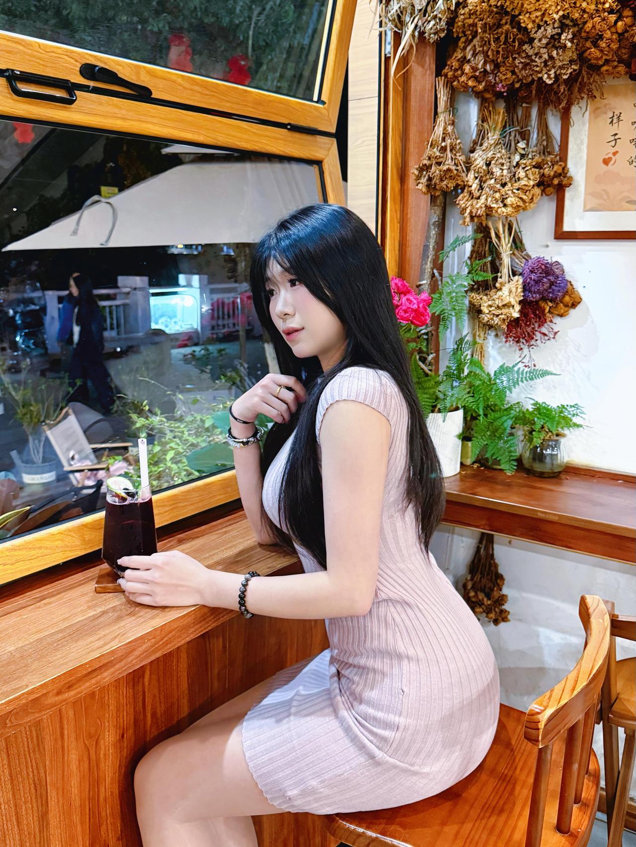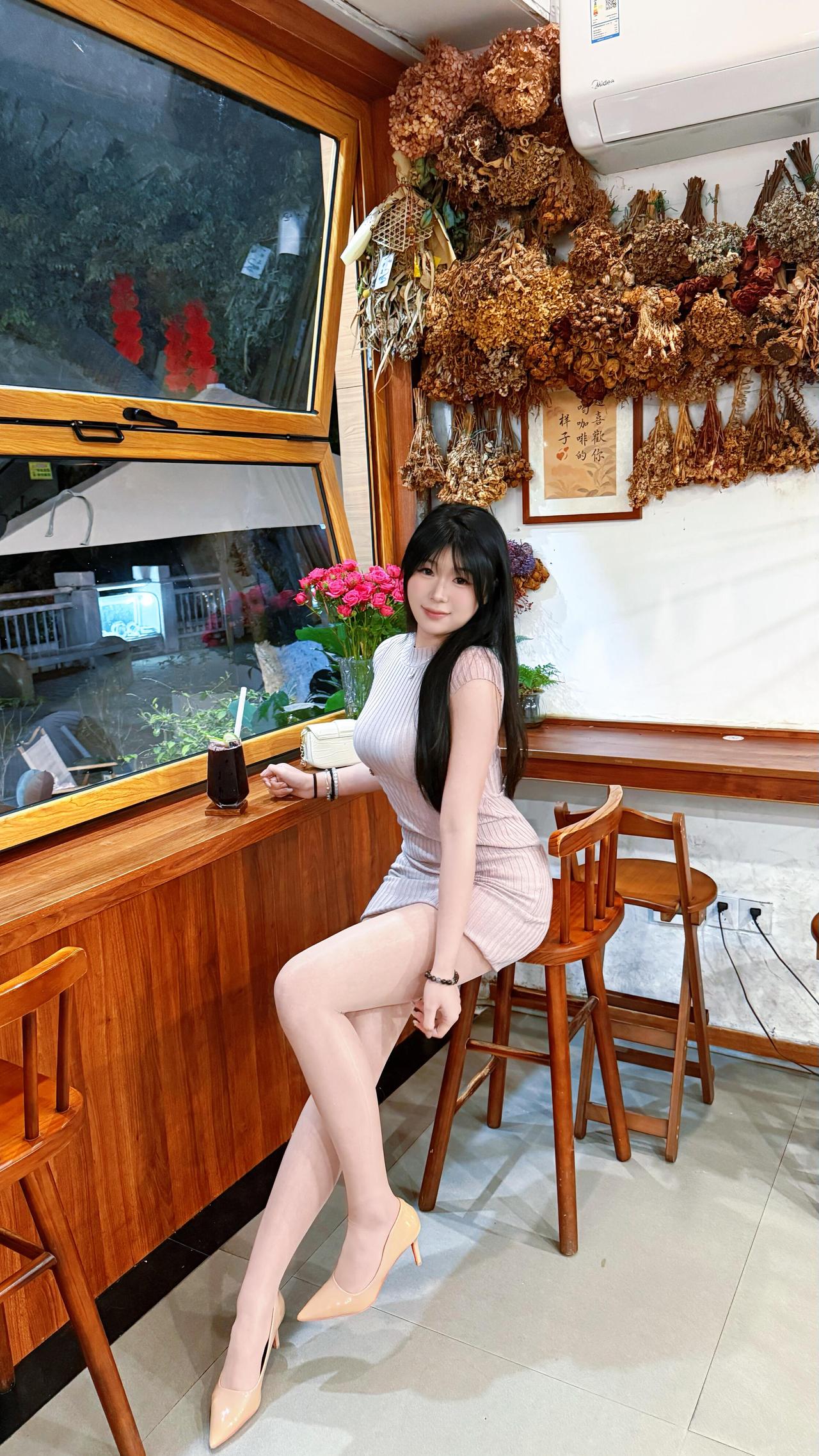 《窗边佳人·粉黛流光》 暖阳斜照木窗旁,干花垂挂满墙香。 绿植点缀添生气,咖啡香气绕梁长。 佳人独坐倚窗旁,粉黛轻施映斜阳。 身着粉裙紧身装,条纹细腻显腰长。 短袖设计露臂膀,肌肤胜雪步生香。 长发披肩垂腰际,柔顺如瀑意绵长。 手戴珠串腕间藏,优雅气质自难藏。 足踏高跟浅色裳,尖头细跟步铿锵。 手捧饮品凝神望,窗外风景入画堂。 或坐或立姿态美,举手投足皆文章。 此情此景难描画,唯有诗篇记流光。 愿君常伴好时光,笑靥如花岁岁香。