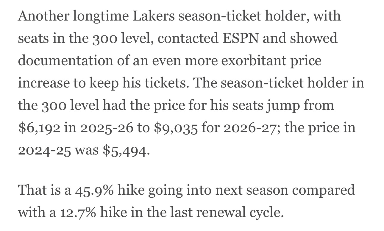 一位长期持有湖人季票的球迷联系了ESPN,价格涨幅甚至更为夸张,这位300区的季票持有者,其座位价格从2025-26赛季的6192美元飙升至2026-27赛季的9035美元,而在2024-25赛季,价格仅为5494美元。