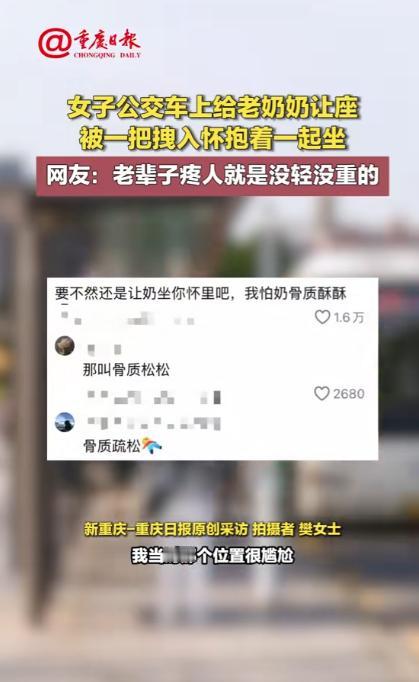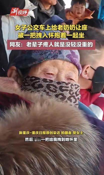 “笑不活了!”甘肃,一女子坐公交途中,发现一个老奶奶没座位站在她旁边,她赶紧起身让老奶奶坐。一开始,老奶奶还推辞不肯坐,后来见女子坚持礼让,便直接坐下,没想到的是,她坐下后就一把将女子拽到她怀里,说和女子一起坐!网友:好人有好“抱”! 早高峰的公交,那简直就是 “人挤人,脚挨脚”,能抢着一个座位,比中了小彩票还开心,在这个时候能够甘愿将自己的座位让给老年人,可谓是非常难能可贵的,2月12号甘肃早上,某公交车上就上演了一出暖心的让座大戏。 樊女士当时正坐在车厢中部的座位上,低头看着手机,安安静静地等着到站,没过多久,公交车停靠站点,一位头发花白的老奶奶慢慢走上车。 老人手里拎着一个洗得干净整洁的碎花布袋子,里面装着刚买的蔬菜和日常用品,腿脚不算灵便,上车后只能紧紧抓着扶手,慢慢挪到姑娘身边站定。 姑娘抬头看到老人站在身旁,没有丝毫犹豫,立刻站起身,笑着朝老人招手,示意她过来坐。 面对姑娘的热心,老奶奶第一反应是连连推辞,摆着手笑着说不用麻烦,自己站一会儿就到地方了,语气里满是长辈对晚辈的体谅。 姑娘却特别坚持,一边轻轻扶着老奶奶的胳膊,一边往旁边让,温柔地说自己马上就下车,座位空着可惜,您年纪大了站着不安全,快坐下歇一歇。 拗不过姑娘的真诚,老奶奶笑着道了谢,慢慢坐到座位上。 本以为这就是一次再普通不过的公交让座,是城市里每天都在上演的善意,可老奶奶接下来的举动,直接让整个车厢都变得热闹又温暖。 老人刚坐稳,生怕姑娘还站着受累,二话不说伸出布满皱纹却格外温暖的手,一把就将还站在旁边的姑娘拽到自己怀里,乐呵呵地让姑娘挨着自己挤着坐。 这突如其来的亲昵操作,让姑娘当场愣了一下,随后忍不住笑出声,乖乖靠在老奶奶身边,更有意思的是,两人是面对面挤在座位上,姑娘的姿势格外尴尬。 往前趴一点就会碰到前面的乘客,往后仰又会压到老奶奶,只能小心翼翼地保持着平衡,全程又好笑又无奈。 车厢里的其他乘客看到这一幕,都忍不住露出会心的笑容,有人悄悄拿出手机拍下这段可爱的互动,传到网上后立刻引发热议。 网友们纷纷被老奶奶的可爱举动逗乐,有人留言说老辈子疼人就是没轻没重,这份直白的温柔太打动人。 还有人玩起谐音梗,说这是名副其实的好人有好 “抱”,一次让座收获了满满的疼爱。 其实在我们生活的城市里,公交车上的暖心瞬间从来都没有缺席过。十米车厢就像一个流动的温暖驿站,藏着数不清的平凡善意。 有人主动给孕妇让座,有人帮老人提重物,有人给迷路的乘客指路,这些看似微不足道的小事,每天都在不同的公交线路上上演。 年轻人用举手之劳传递温柔,老人用最朴素的方式回馈善意,没有客套的寒暄,没有刻意的表演,只有陌生人之间最纯粹的真诚。 老奶奶拽着姑娘同坐的举动,看似有些 “莽撞”,却藏着最真挚的心意。 在老人的心里,姑娘给自己让座是贴心,那自己就要把姑娘拉到身边疼着,没有多余的想法,就是打心底里喜欢这个热心的孩子。 这份不掺任何杂质的疼爱,比任何华丽的感谢都更有力量,也更让人觉得温暖。 姑娘的让座是本能的善良,老人的拥抱是直白的回馈,一来一往之间,陌生的两个人变得格外亲近,小小的公交座位上,盛满了人间烟火气里的温柔。 这样的双向奔赴,没有任何刻意的雕琢,就是生活最本真的样子,也正是这份真实,让无数网友产生共鸣。 在这个信息快速更迭的时代,人们看过太多争执与矛盾,反而更容易被这种简单的美好打动。 公交让座本是小事,被老人拽进怀里也是意外,可这份突如其来的温暖,却能瞬间抚平生活里的疲惫。 善意一直在悄悄传递,每一个主动伸手的人,每一个真诚回馈的人,都在为这个世界增添一份温暖。 对于这件事,您有什么想说的吗?欢迎评论区留言讨论。 信源:新重庆-重庆日报2026-02-12——《女子公交车上给老奶奶让座被一把拽入怀抱着一起坐网友:老辈子疼人就是没轻没重的》