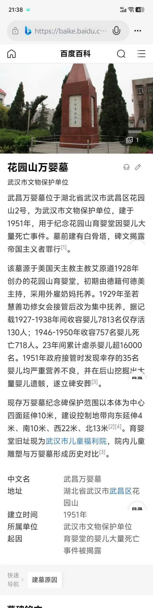 武昌万婴墓位于湖北省武汉市武昌区花园山2号,为武汉市文物保护单位,建于1951年,用于纪念花园山育婴堂因婴儿大量死亡事件。墓前建有白骨塔,碑文揭露帝国主义者罪行 。 该墓源于美国天主教主教艾原道1928年创办的花园山育婴堂,初期由德籍何德美主持,采用外雇奶妈托养。1929年圣若慧善功修女会接管后改为集中抚养,据记载1927-1938年间收容婴儿7813名仅存活130人;1946-1950年收容757名婴儿死亡718人。23年间累计虐杀婴儿超16000名。1951年政府接管时发现幸存的35名婴儿均严重营养不良,并在后山挖掘出大量婴儿遗骸,遂立碑安葬。