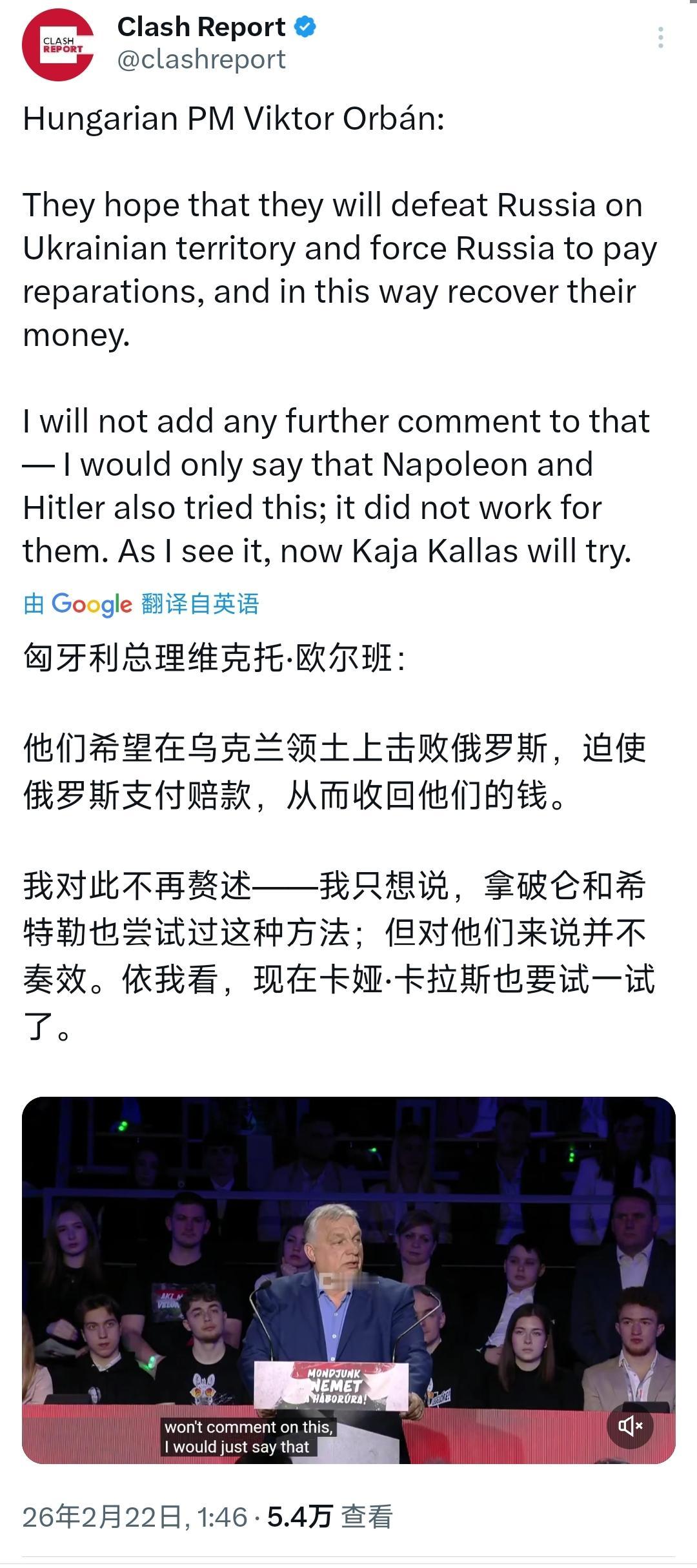 匈牙利总理欧尔班今天(北京时间2月22日)表示:“他们希望在乌克兰领土上击败俄罗斯,迫使俄罗斯支付赔款,从而收回他们的钱。我对此不再赘述我只想说,拿破仑和希特勒也尝试过这种方法;但对他们来说并不奏效。依我看,现在卡娅·卡拉斯也要试一试了。” [机智]评几句:除欧尔班之外的欧盟成员国领导人,几乎清一色选择对俄罗斯强硬到底,唯有匈牙利总理欧尔班特立独行,公开将欧盟高层的对俄路线与历史上的极端扩张者相提并论,成为欧盟内部不折不扣的另类。他的言论虽刺耳,却戳中欧盟对俄政策的现实困境,而欧盟主流阵营仍在强硬路线上一路狂奔,不愿正视制裁反噬与战争长期化的代价。谁对谁错,历史与时间终将给出公正判断,眼下欧盟内部裂痕难弥合,地缘对抗情绪居高不下,缓和对俄关系的道路依旧漫长且布满障碍,欧洲的安全与稳定仍在博弈中持续消耗。