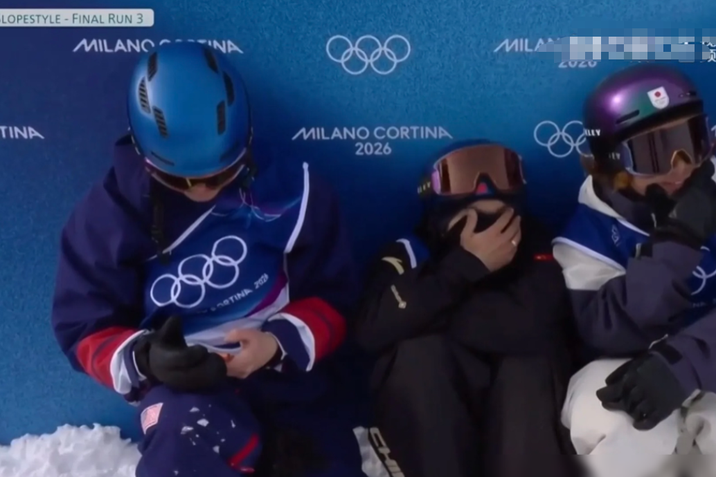 三人缩成一排,谁都不敢看大屏幕。冠军苏翊鸣,把面罩推上去,捂住眼睛。拿第二的嘿嘿笑,反正有牌了。第三的最紧张,玩手机,还不会亚洲蹲。网友说,像三个逃课被逮的学生。